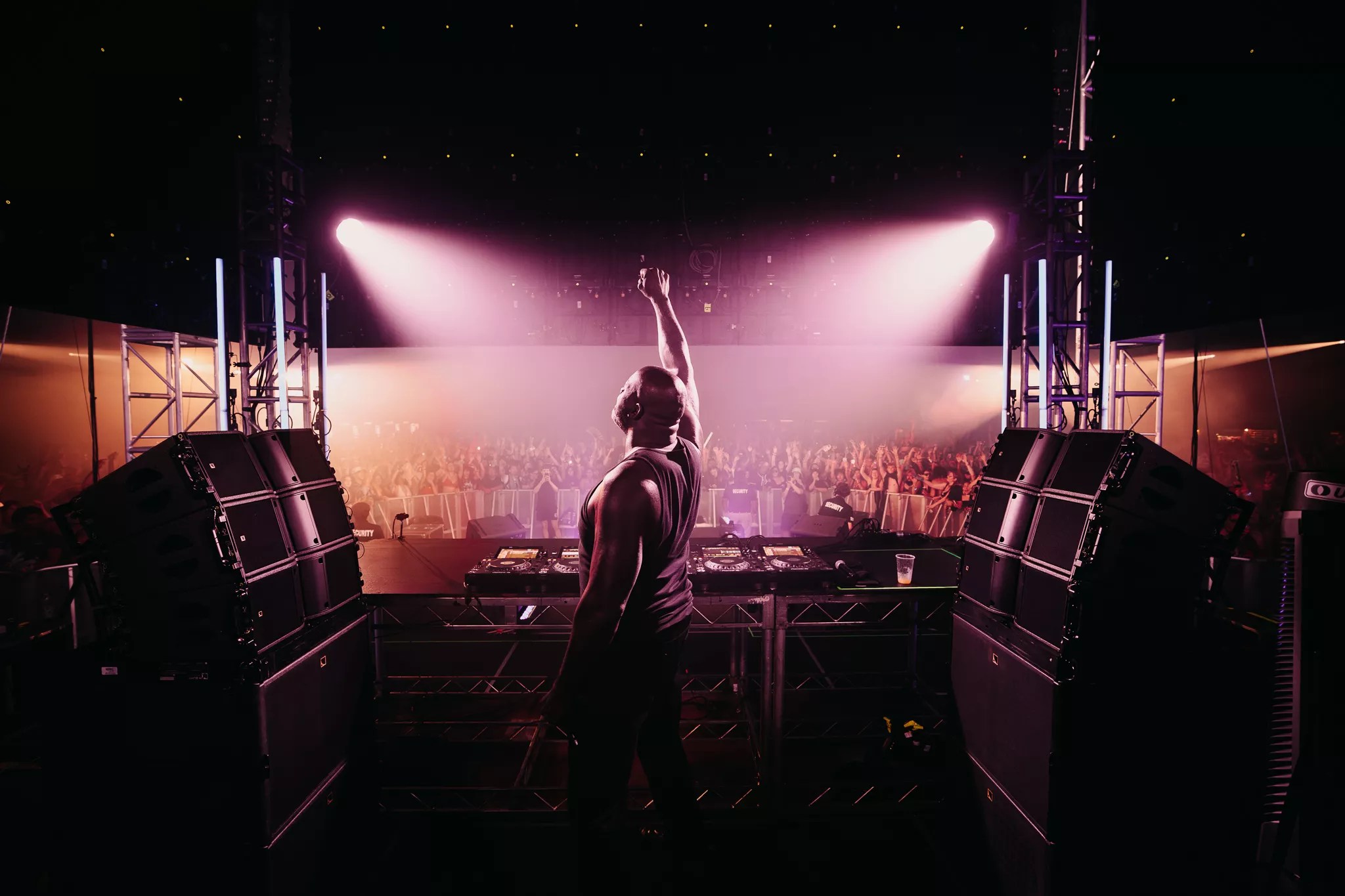 Just after 9:30, Jkyl & Hyde was on the square stage, where general attendees stood around three sides, with VIP sections behind, looking at the DJ from the back. Screens on each side of the stage showed Jkyl & Hyde moving to what sounded like a machine breaking down as he worked the digital audio console, while behind him, a short video of a green-tinted journey through a cavern played on repeat, followed by a similarly short video of bare, angular, skeletal trees. Once at the threshold of the hall, the sound was immense enough to buzz the sternum and tingle the dangling earlobes. Most DJ names on the bill, except Diesel, seemed to adhere to conventions of spelling and length prevailing for vanity license plates, perhaps intended more to enter in a search bar than to be pronounced aloud in a conversation. To stage left and right, behind the partition keeping the audience back, basketball hoops, rising perhaps twenty feet, stood back-to-back in pairs, their nets so tight and narrow no ball could ever have passed through.