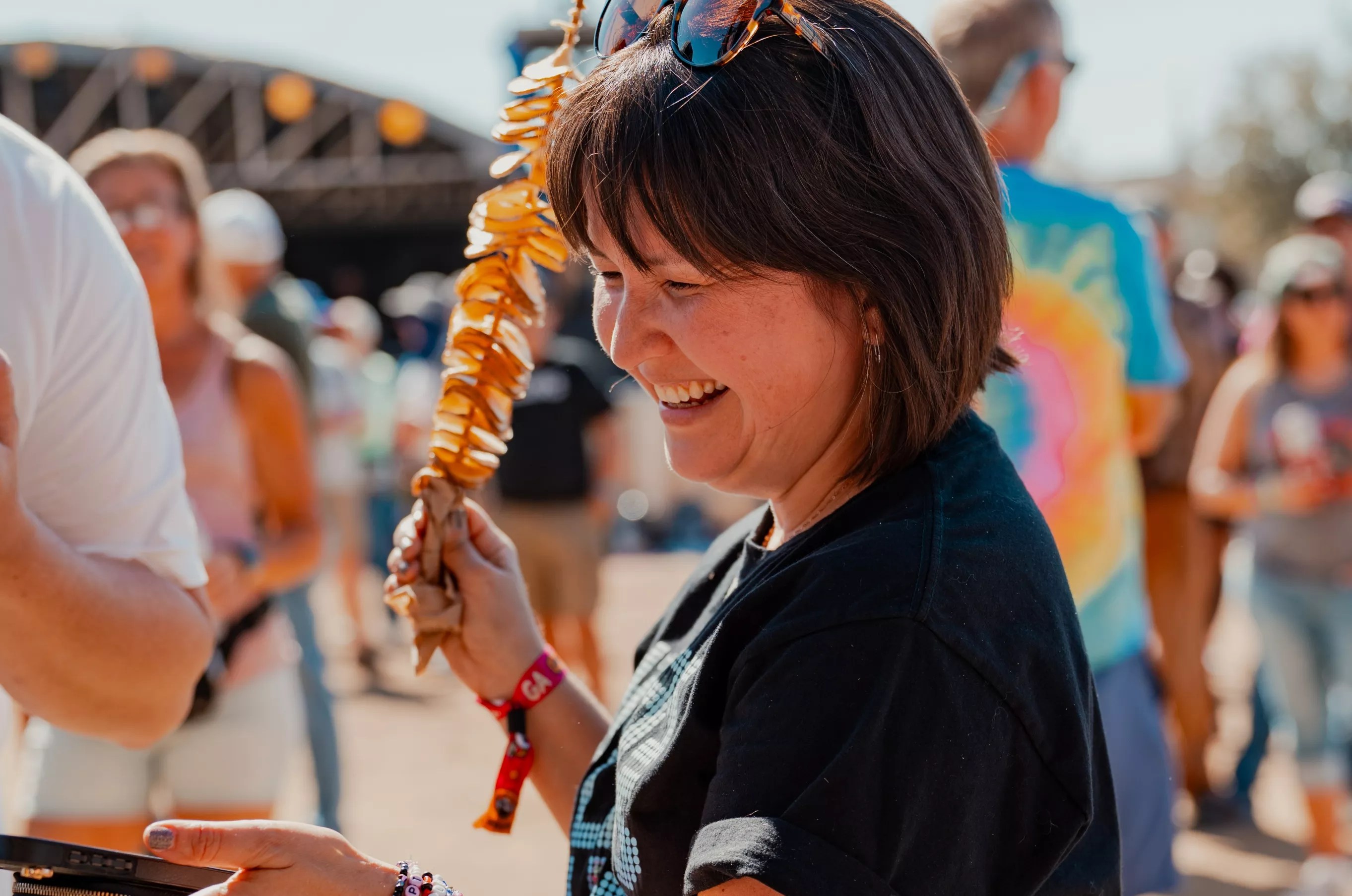 A fan eats a “tornado potato” during Innings Fest 2025.