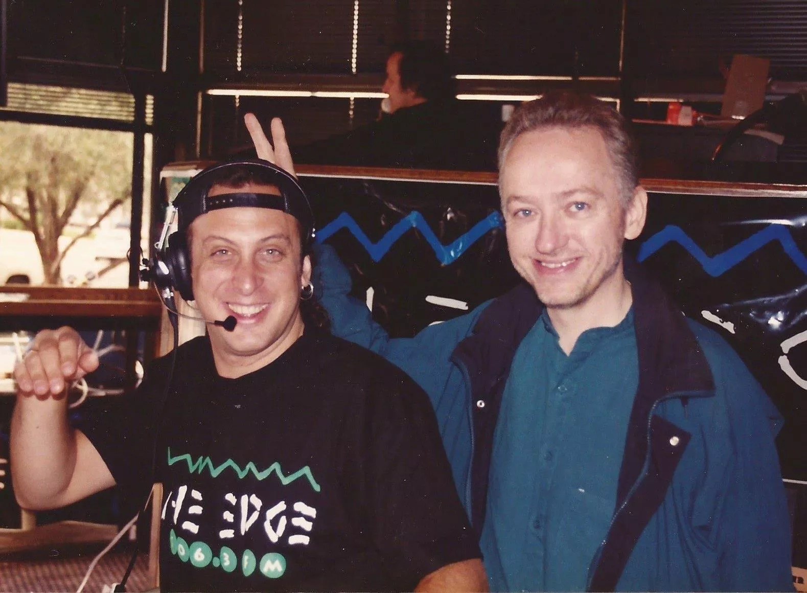 One of The Edge’s first morning jocks Willobee (left) in 1993 with then-program director John “Edison” Clay.