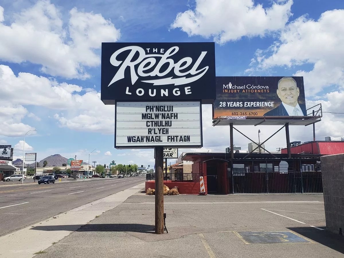 During the COVID-19 pandemic in 2020, Rebel Lounge patrons who donated to support its employees could have a short message placed on the venue’s marquee. One patron chose the Lovecraftian language of Cthulhu.