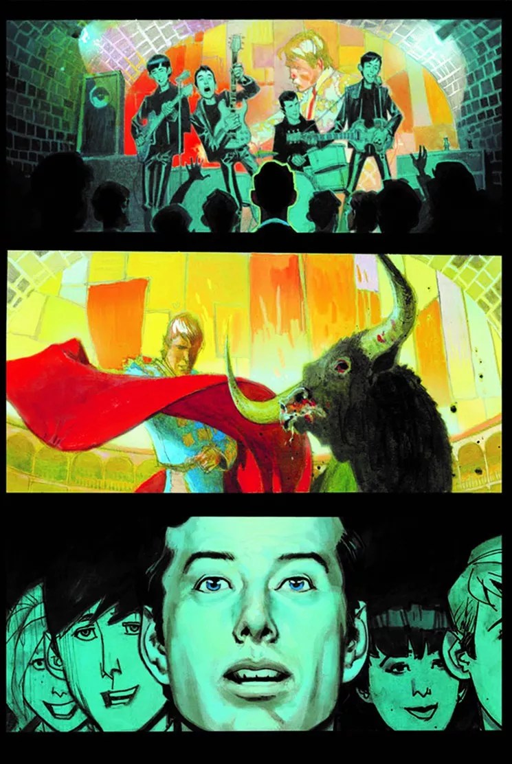 Brian Epstein watches in awe as the Beatles perform in Liverpool, juxtaposed with images of a bullfighter.