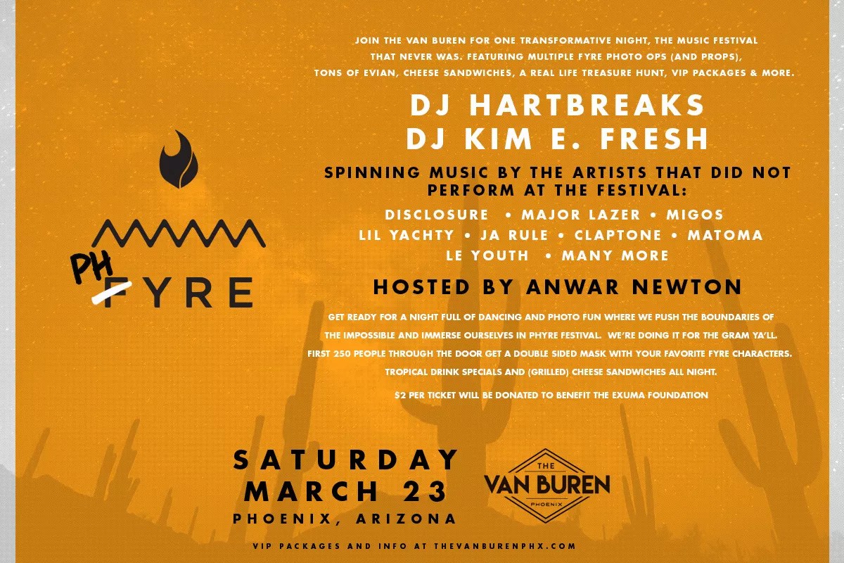 On February 20, 2019, a familiar orange square popped up on the Van Buren Instagram. “Something is coming,” they promised, “Something immersive, transformative, and … lit *fire emoji*.” Days later, the announcement came: Phyre Festival, one #transformative night at The Van Buren with DJ Hartbreaks and DJ Kim E. Fresh spinning the soundtrack to the fest that never was. Furthermore, the event will be hosted by Ja Rule fanatic and This Week Sucks Tonight host Anwar Newton.