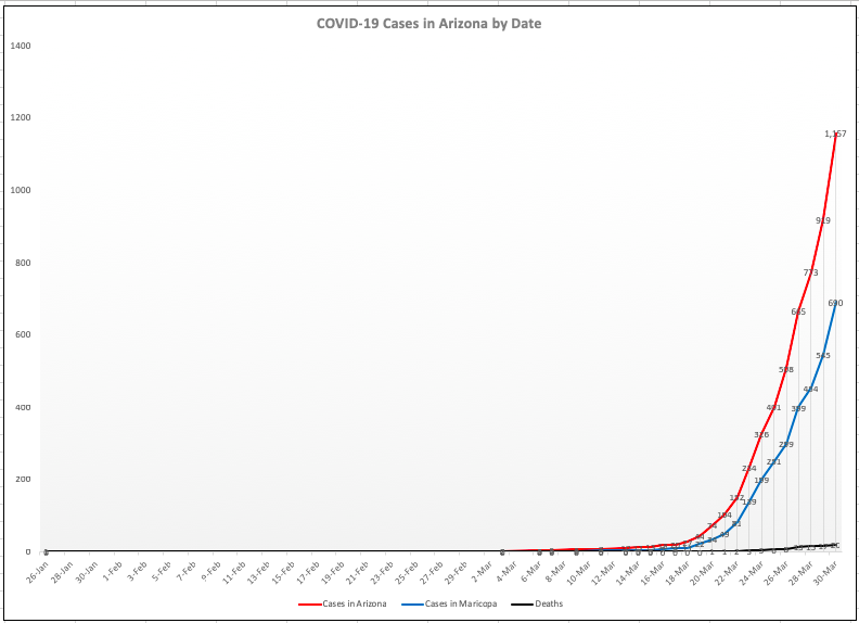 Over 1,000 people in Arizona now reportedly have tested positive for COVID-19 as the state ramps up testing but lags in other measures to stop the spread of the virus. It wasn’t until this afternoon that Governor Doug Ducey followed the lead of 28 other states by issuing a stay-at-home order.