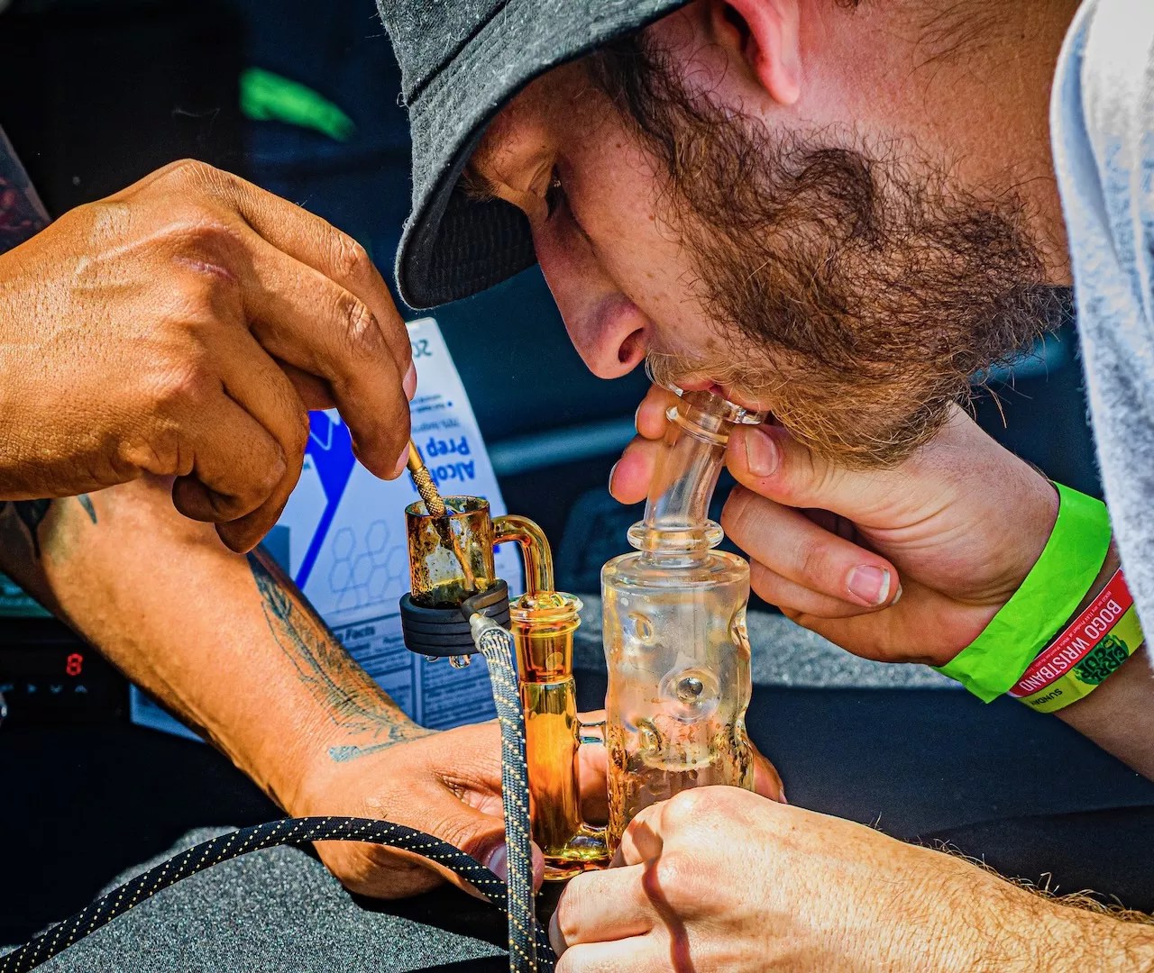 An Errl Cup attendee takes a hit out of an electric dab rig.