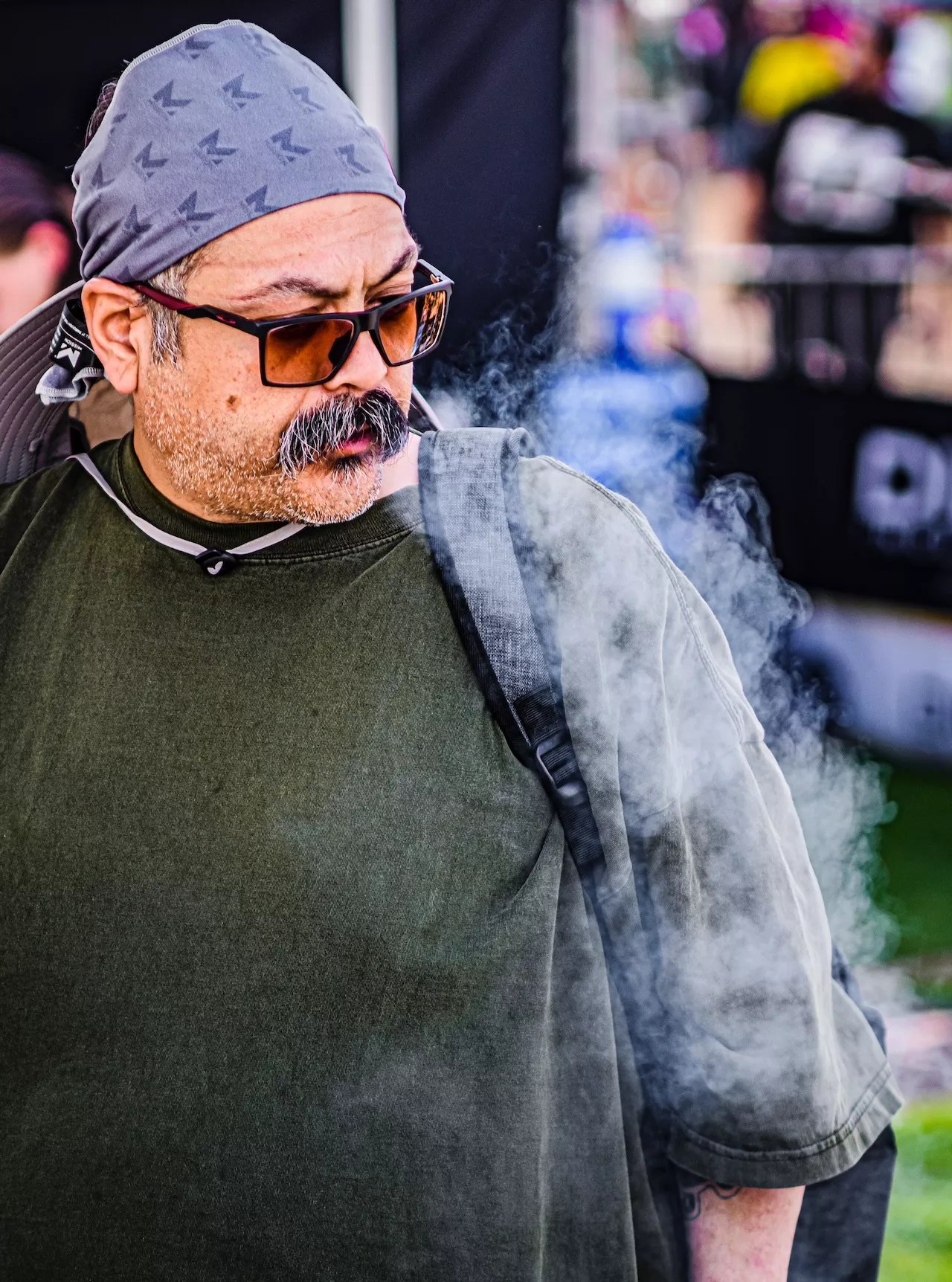 An attendee exhales smoke at the 2024 spring Errl Cup.