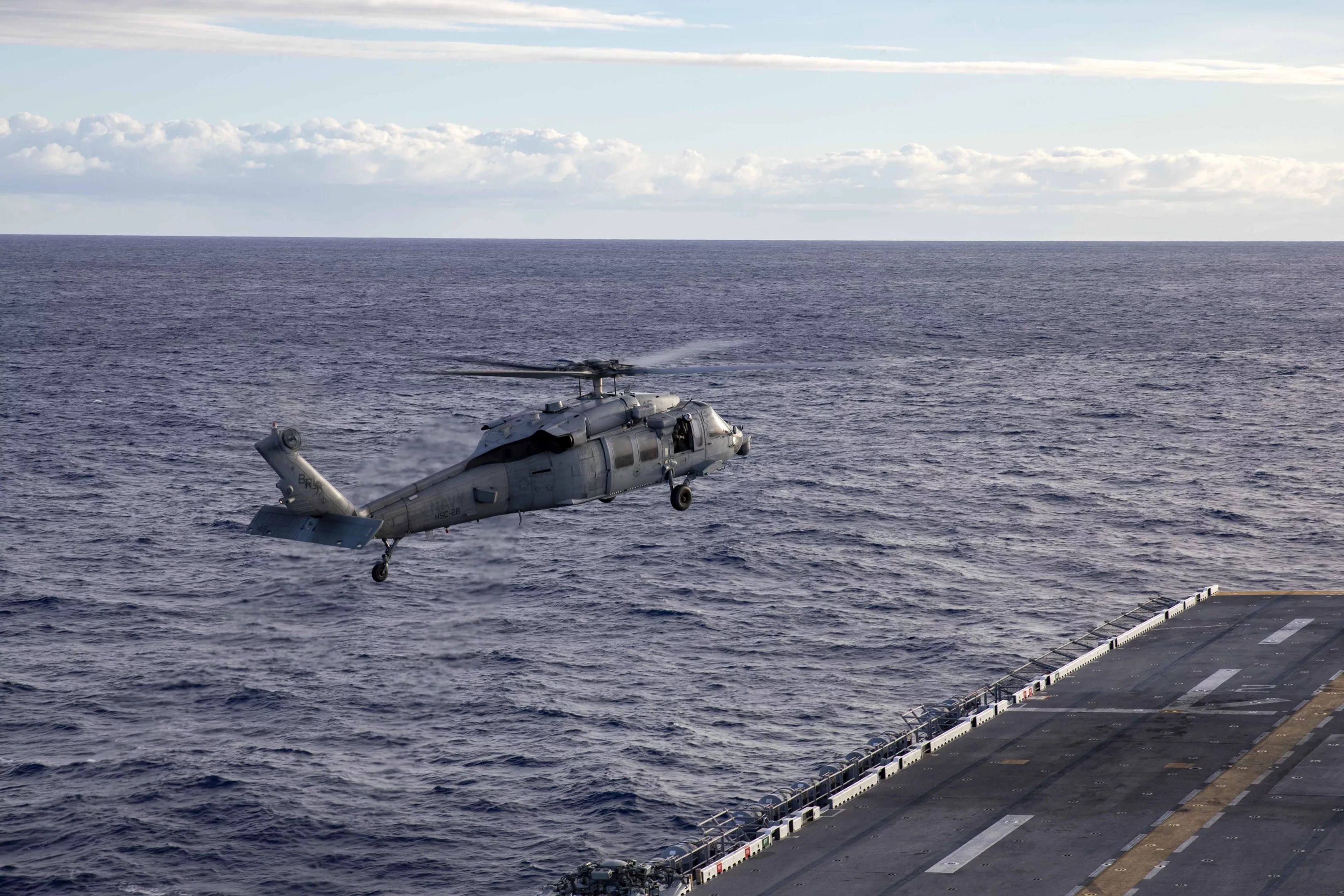 An MH-60s Sea Hawk Helicopter, assigned to Helicopter Sea Combat Squadron (HSC) 28, prepares to land on the flight deck of the amphibious assault ship USS Bataan (LHD 5), Dec. 24, 2019.