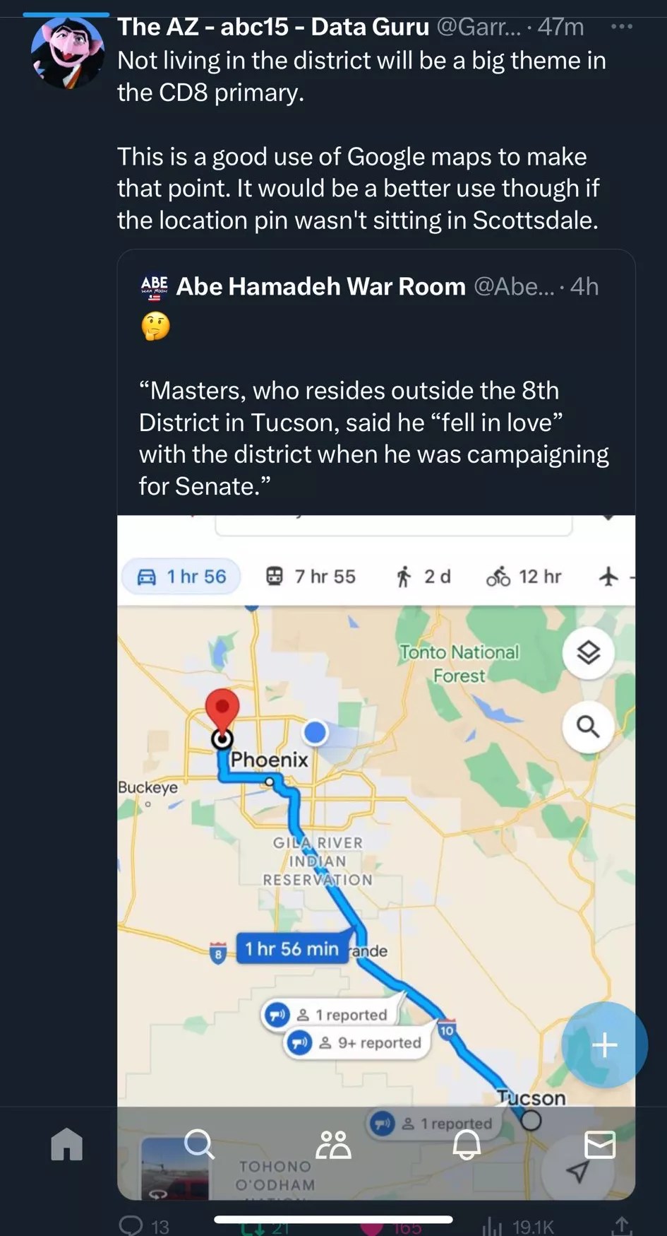 But as ABC15’s Garrett Archer noted, the location showed Hamadeh was in Scottsdale when he created the map. Oops!