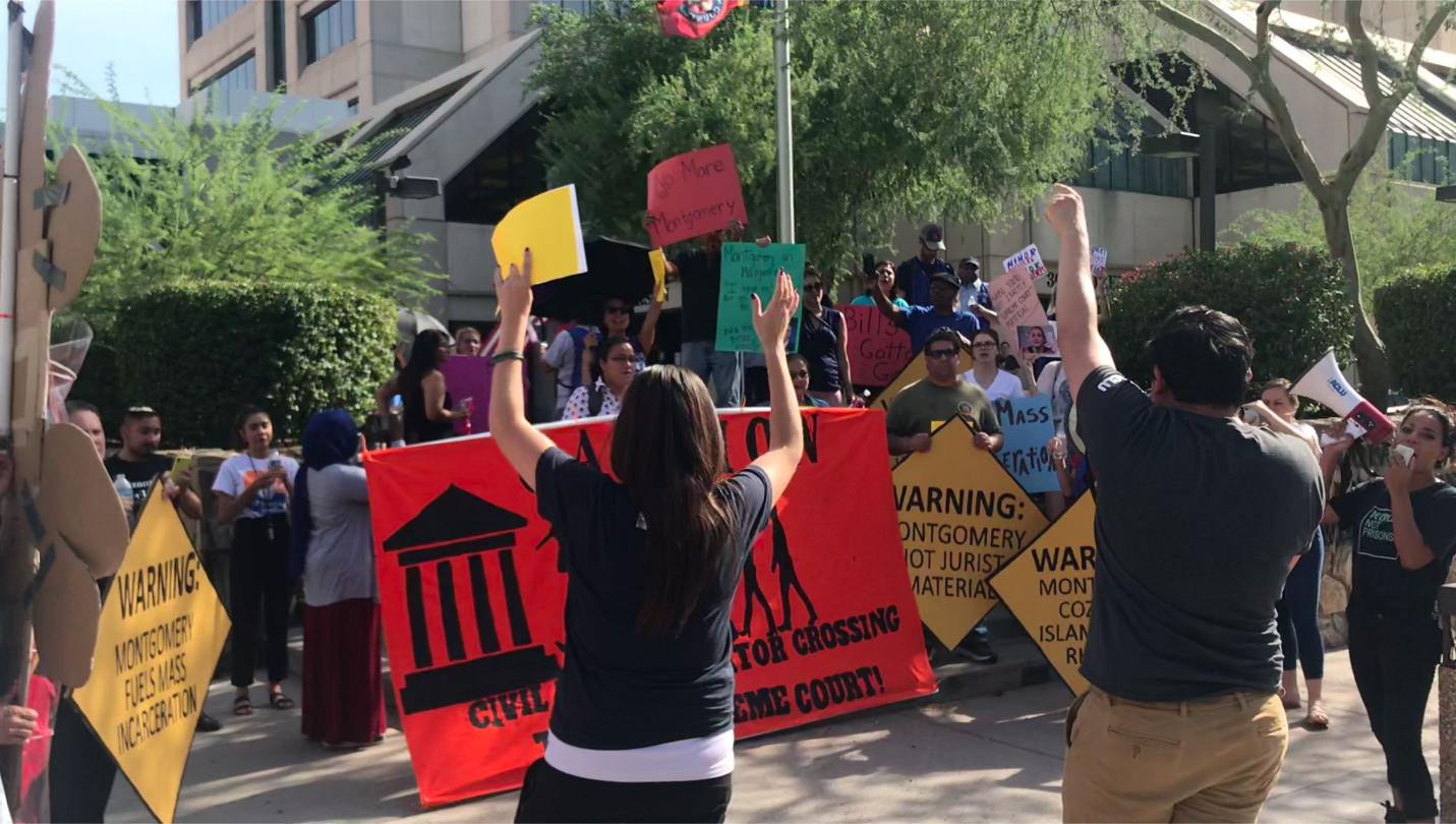 Despite sweltering triple-digit temperatures, dozens gathered outside the Maricopa County Attorney’s Office on Thursday holding signs like, “Warning: Montgomery fuels mass incarceration,” and “Prison is the poison that Bill Montgomery sells as the cure for everything. Don’t buy it.”