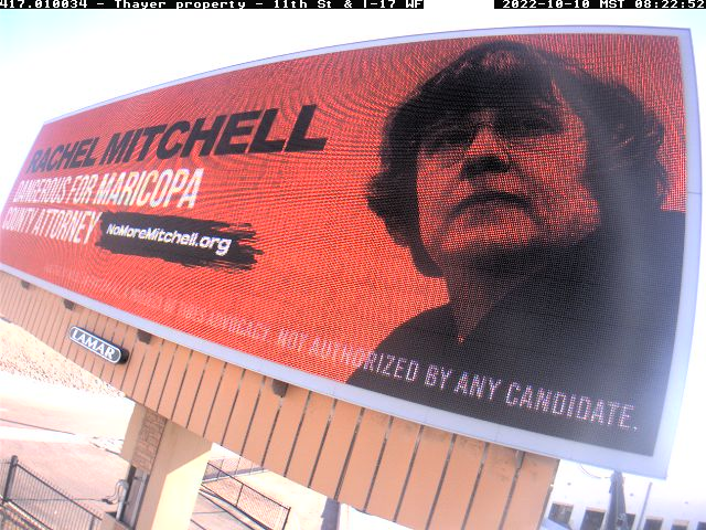 The bright red signs that protesters held on Wednesday are smaller versions of ones that will be seen above freeways across Maricopa County. Mass Liberation also launched a billboard campaign against Mitchell – like the organization did in 2021 during a lengthy, and ultimately successful, campaign demanding the resignation of former County Attorney Allister Adel.