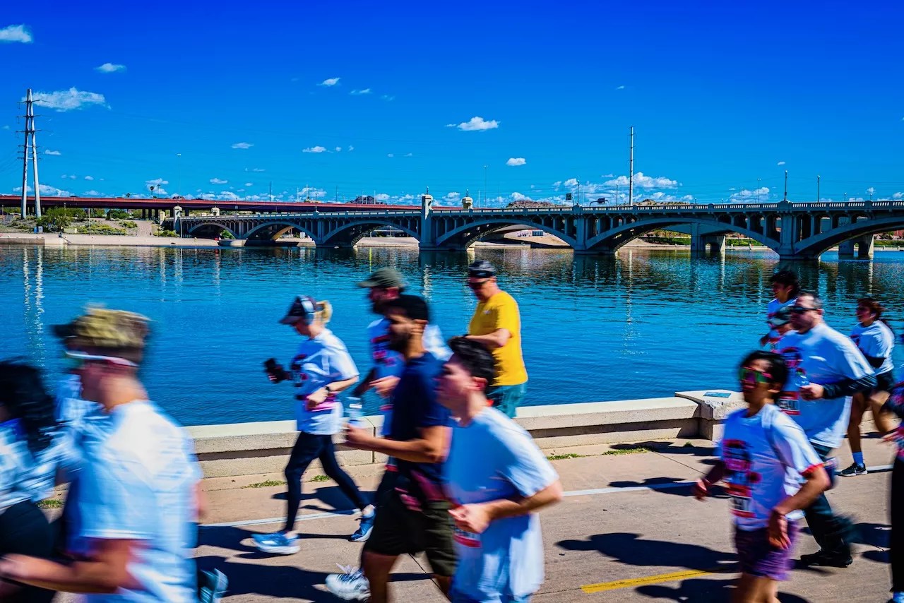 Blue skies create a picturesque backdrop as a group of participants run along Tempe Town Lake.