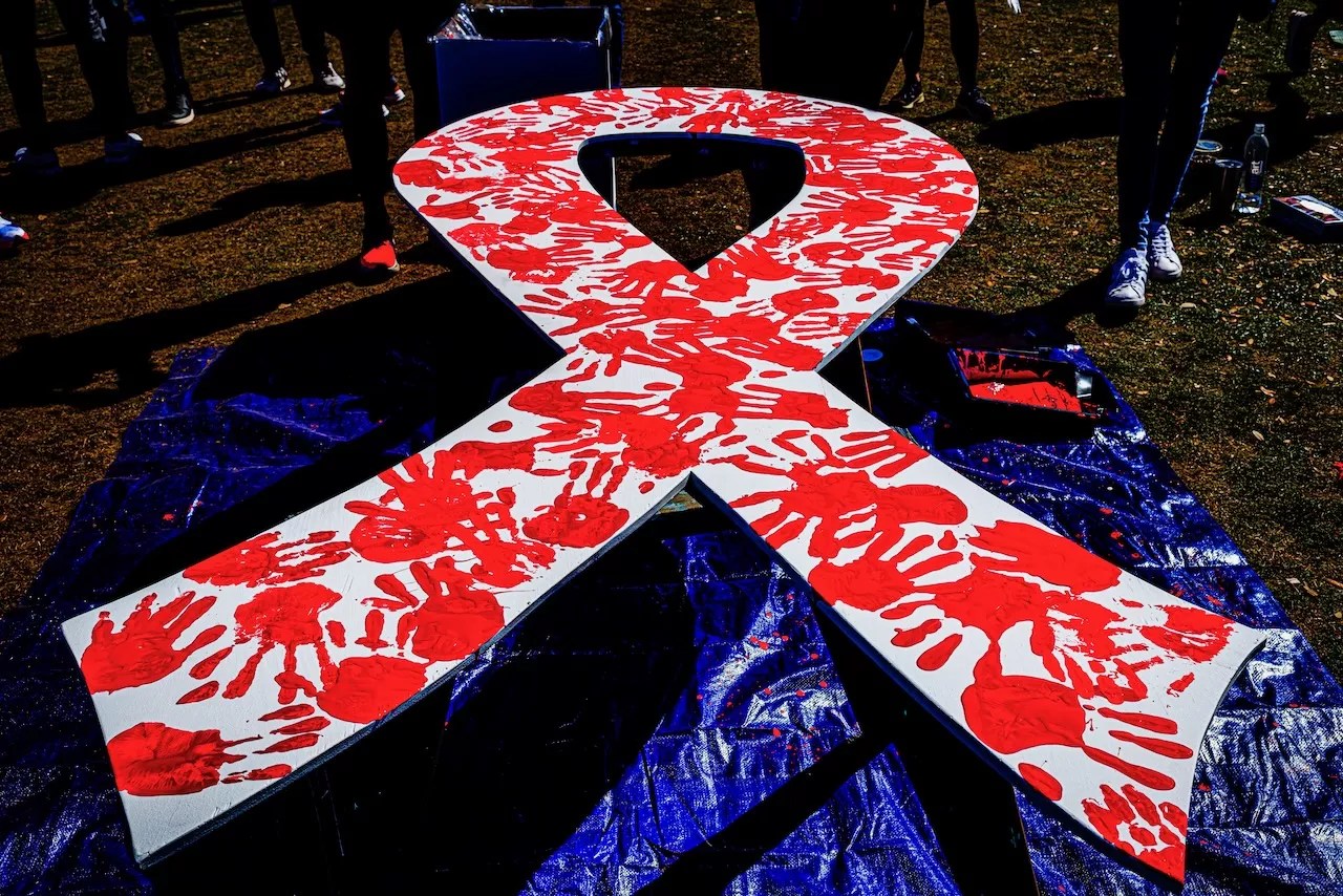 A cutout of a red ribbon, a symbol of HIV awareness, is covered in hand prints and displayed at the event.