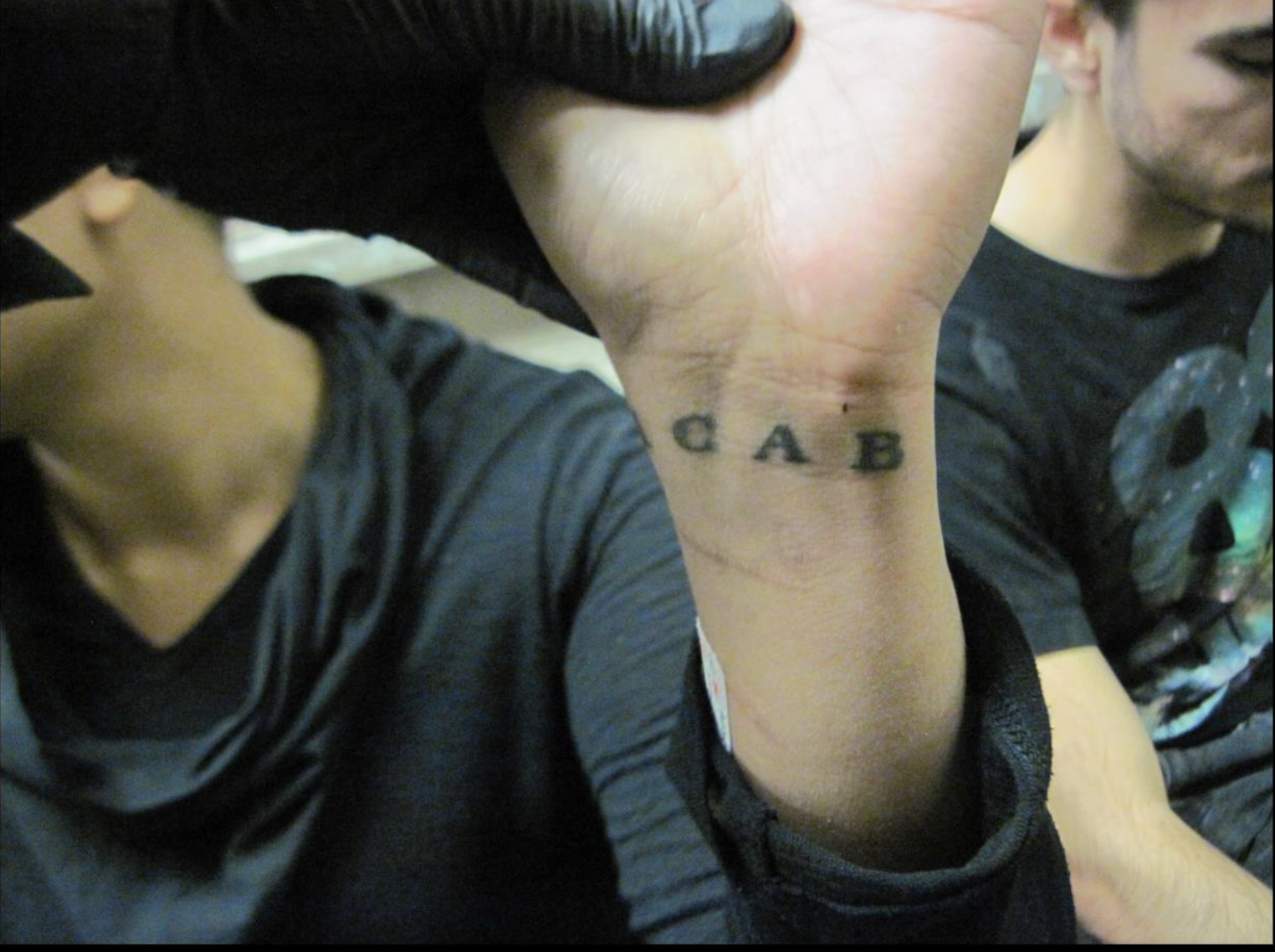A photo of an arrested protester’s “ACAB” tattoo. Prosecutors cited the tattoos as evidence that the demonstrators were in a gang.