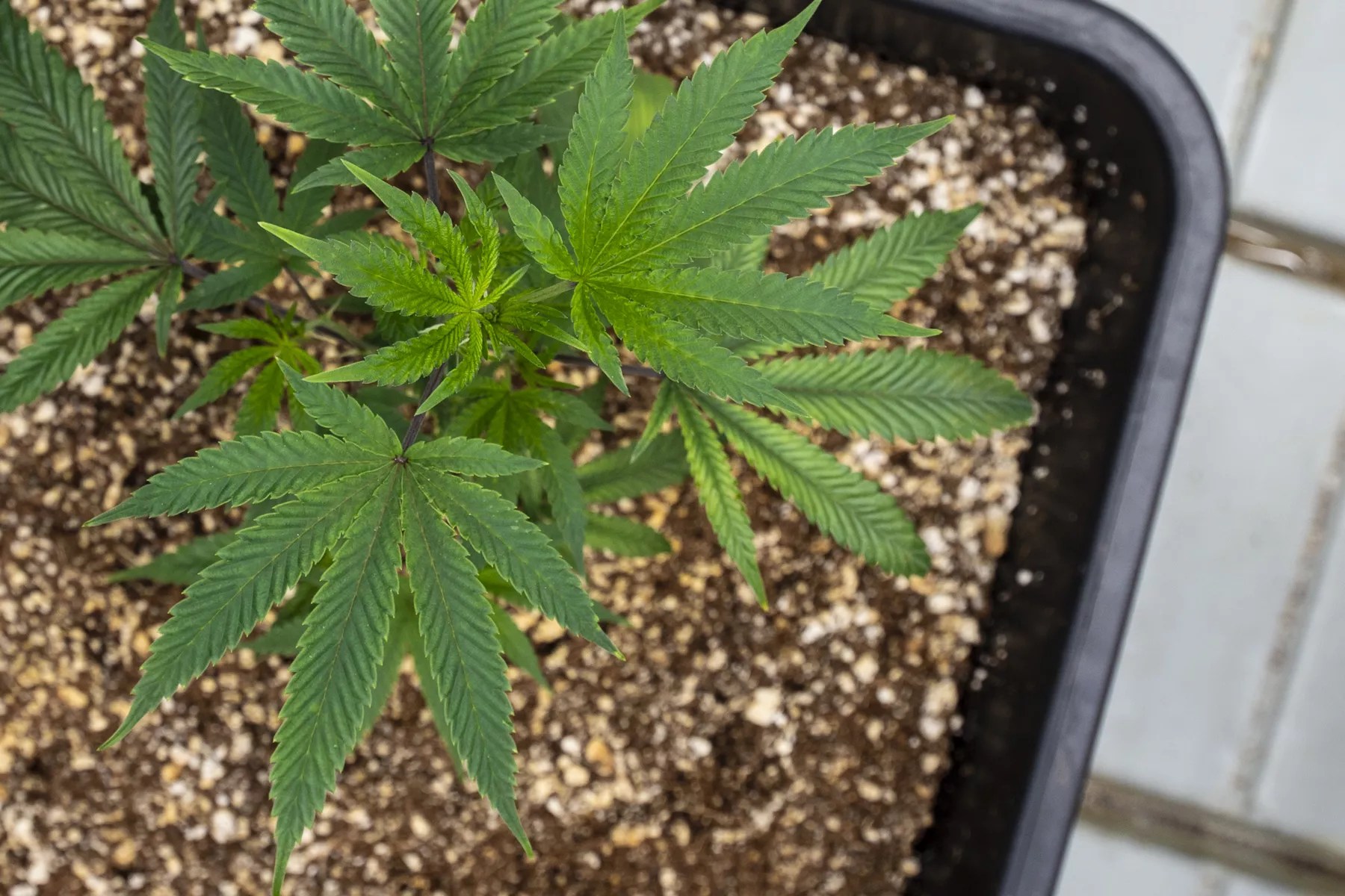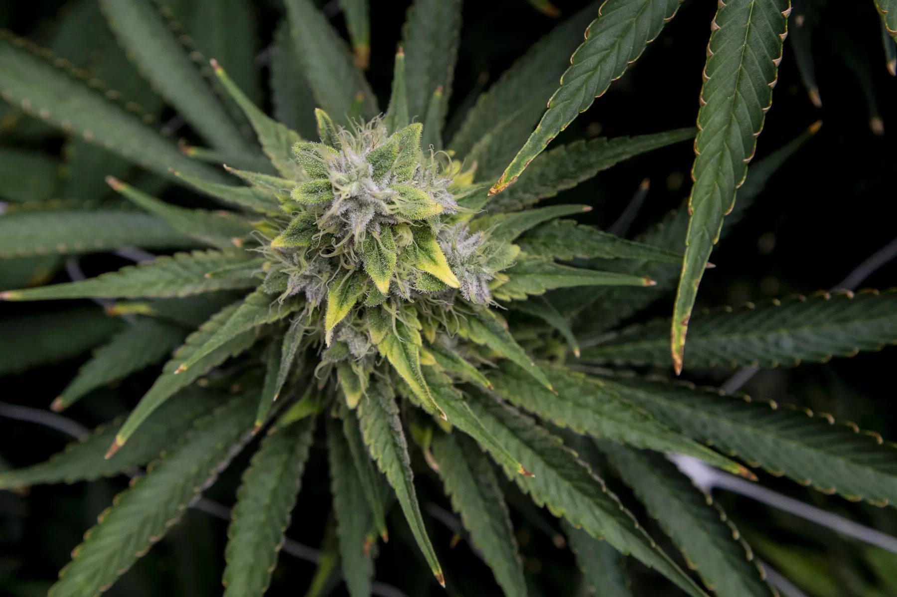 A flowering cannabis plant that is close to being harvested. The white, diamond-like texture are trichomes, or the resin glands of the plant that contain THC, CBD and other active cannabinoids.