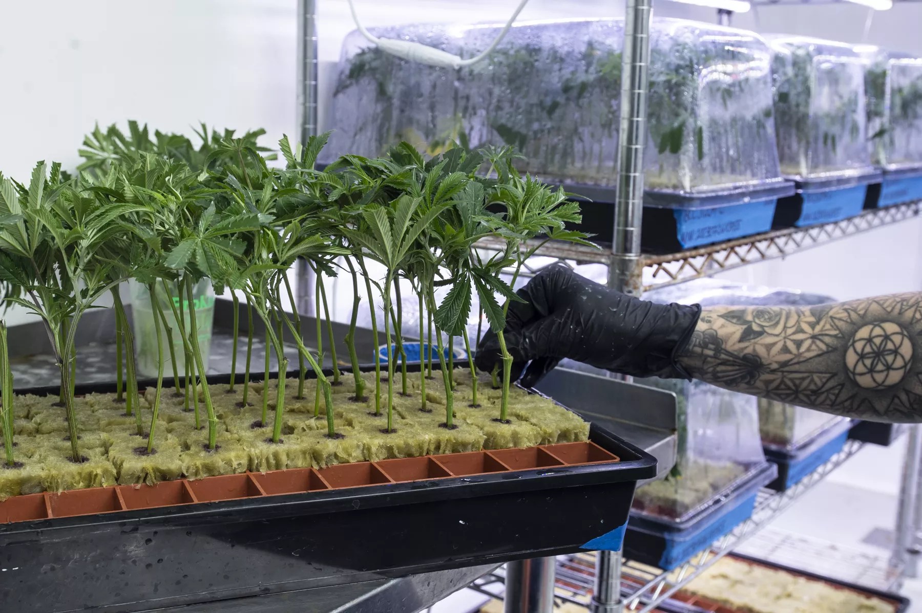 Budding cannabis clones thrive in 22Red’s high-tech mom room.
