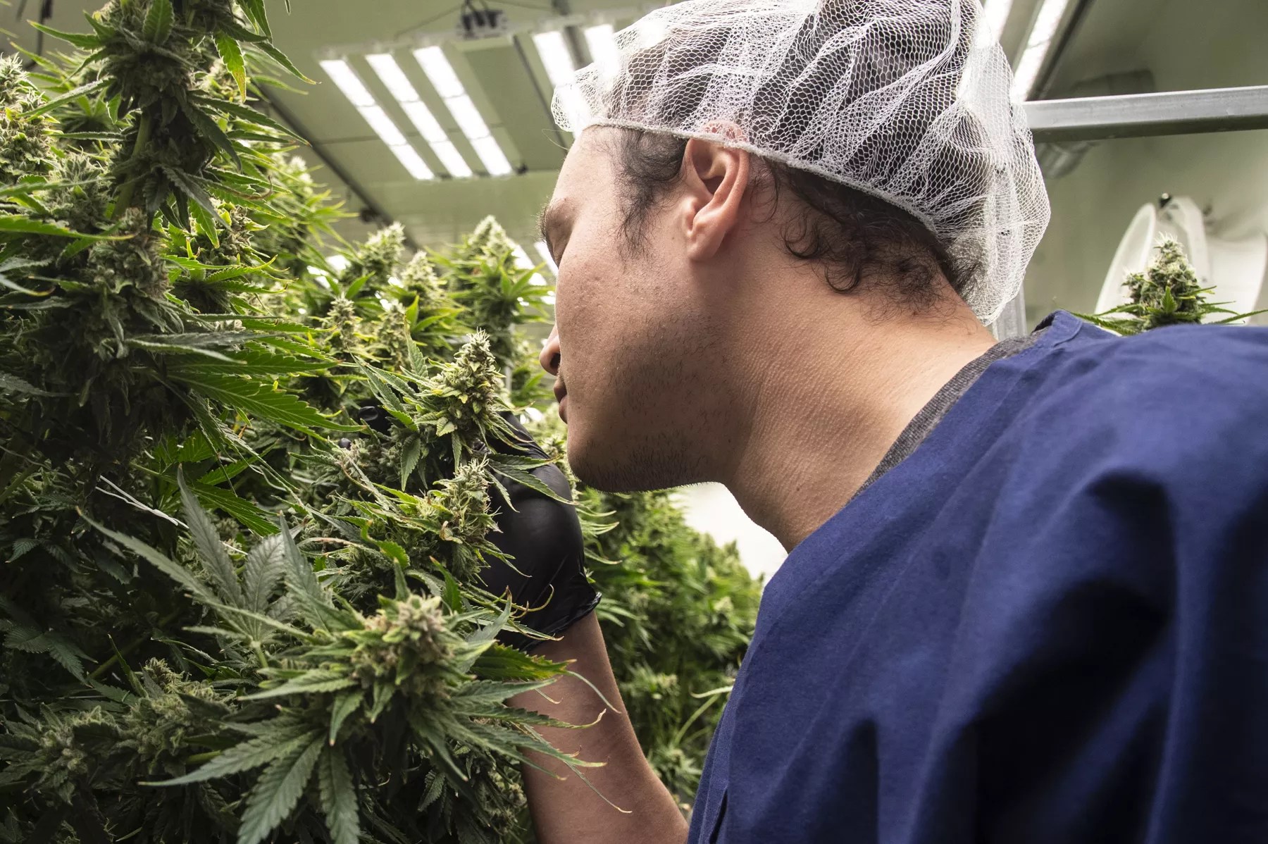 22Red’s Arizona sales rep, Gustavo Briseno, takes a deep inhale of the potent flowering plants about to be harvested.