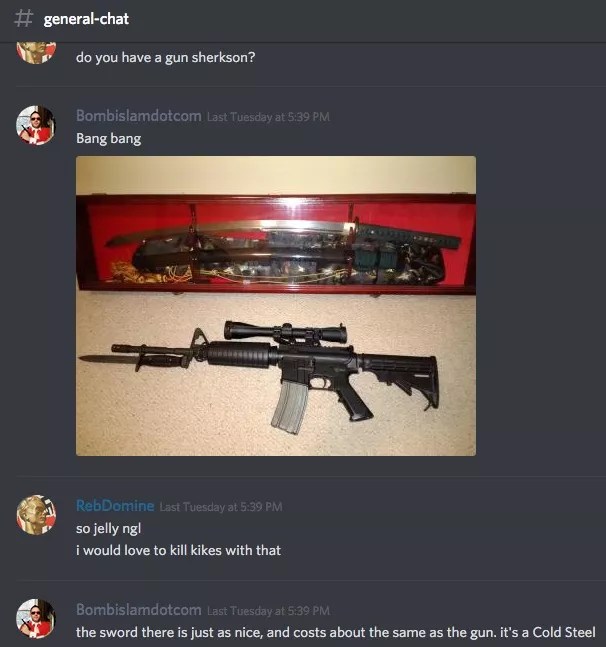 Robert Sterkeson showing off a samurai sword and an assault rifle in a right-wing Discord chat.
