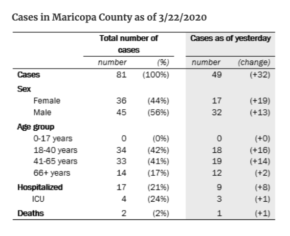 In Maricopa County, 32 additional people have tested positive for COVID-19 since Saturday, bringing the countywide total to 81. Maricopa County has community spread of the virus (meaning the source of the infection is unknown). The county has the state’s highest concentration of cases and has been the only place so far where deaths have been reported.