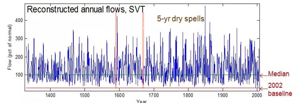 Yet even during those long droughts, the tree rings showed that the longest consecutive number of years with below-average river flow was five. In other words, for 670 years, the region could count on at least one good, wet winter with above-average runoff of snowmelt from the mountains for one year out of five.