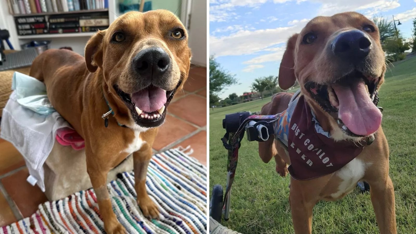 Rebecca Arizmendi with Yaqui Animal Rescue sent Butters to the Special Needs Animal Welfare League in early summer (left). By late summer, the dog was so thin his hip bones were visible (right).