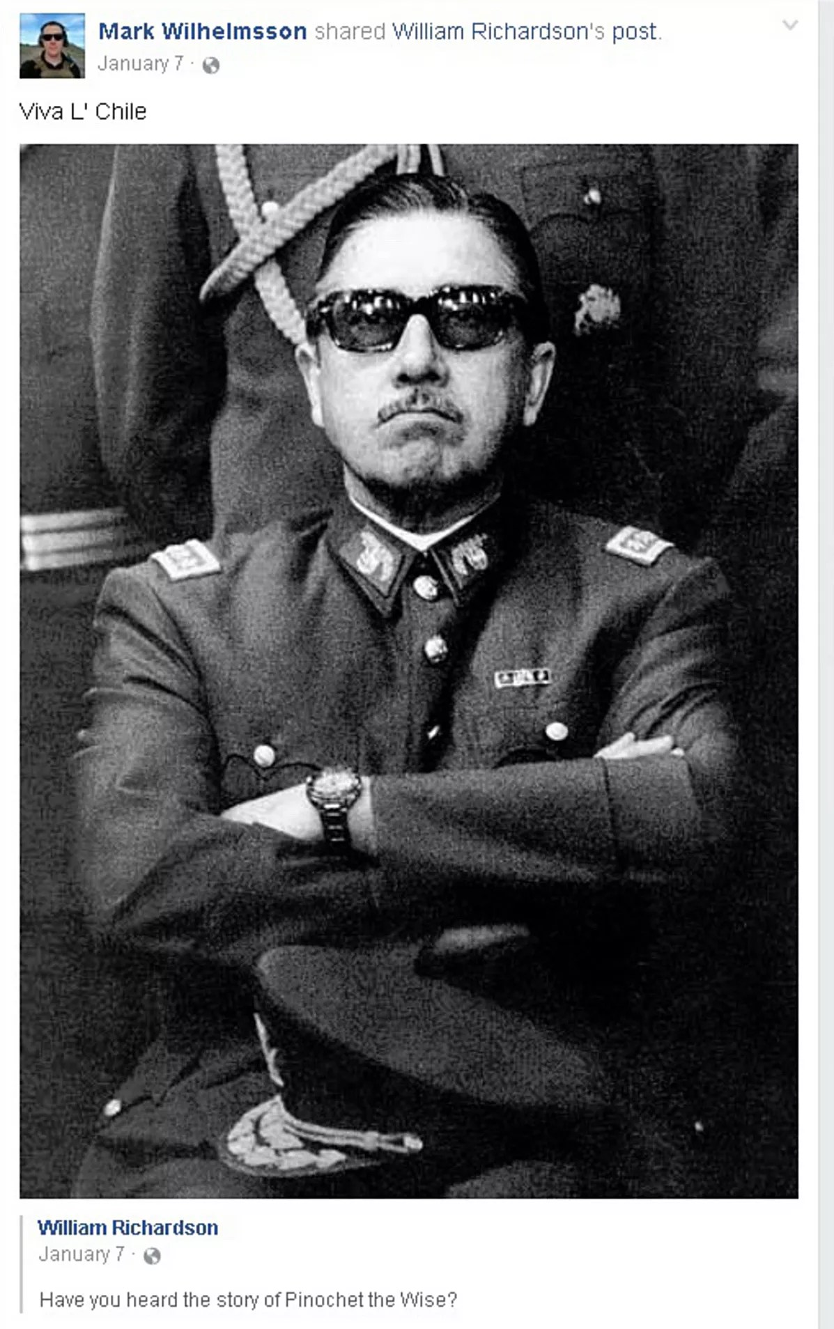 Wilson’s Facebook page contained a number of images that reference elements of the Third Reich, as well as the brutal dictatorship of Chilean strongman Augusto Pinochet, who ruled that South American country from 1974 to 1990.