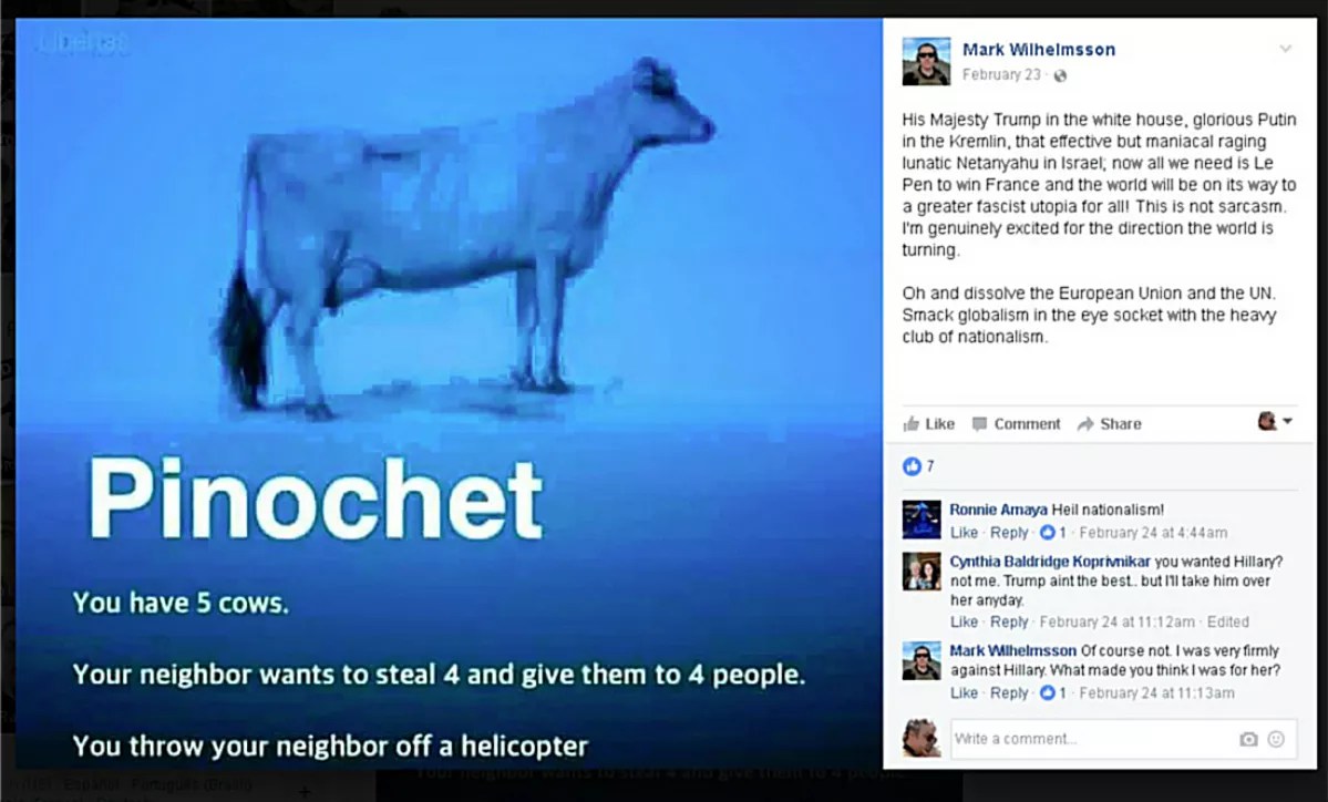 As for the Pinochet meme and its mention of helicopter rides, Wilson said that it was “kind of a joke that people throw around,” ever since Philippines President Rodrigo Duterte claimed that he once had thrown an alleged kidnapper out of a helicopter.