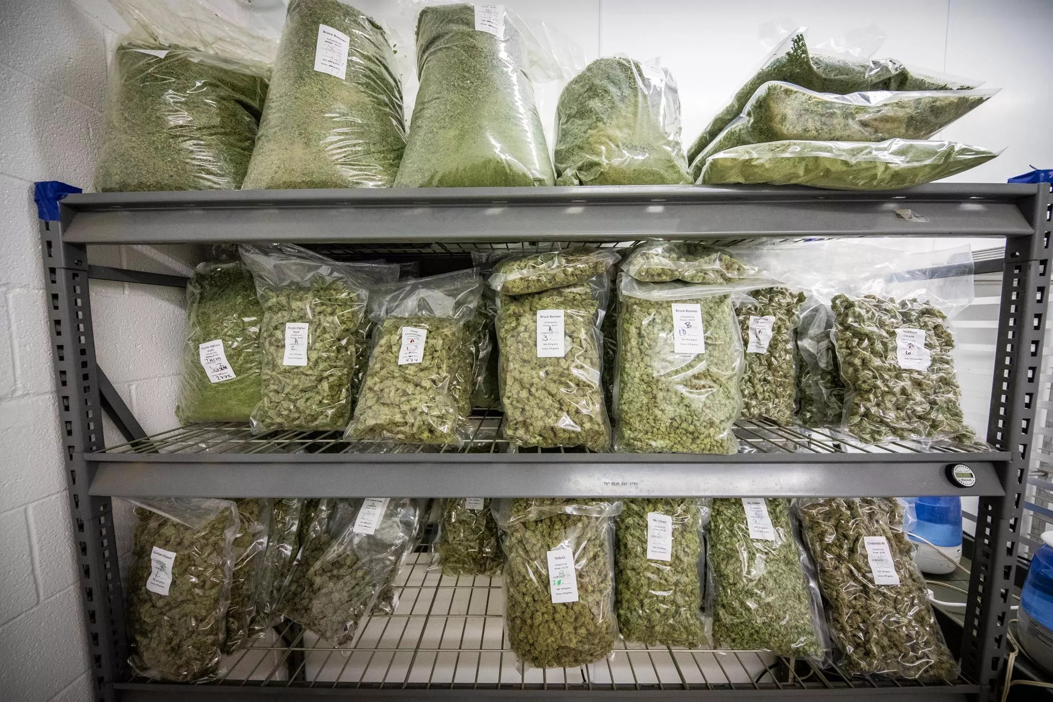 In one room the size of a walk-in closet, thousands of tiny seedlings spawn their first roots in plastic trays. Next door, in the green canopy of the 6,400-square-foot vegetation room, three Roomba vacuums zoom across the concrete floor every morning, scooping up fallen leaves and dirt. Deeper within the building, pungent, drying buds dangle from clothes hangers, waiting to be packaged into fat plastic bags.