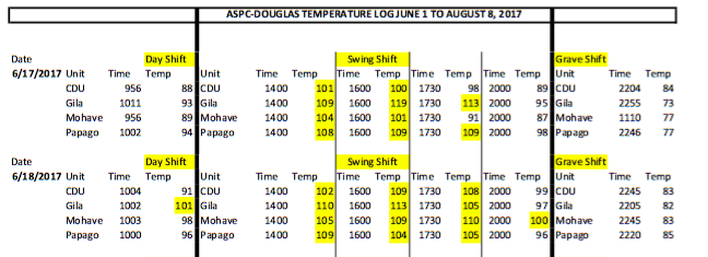 Temperature logs submitted by the Arizona Department of Corrections as part of the Parsons v. Ryan lawsuit show that daytime indoor temperatures frequently exceeded 100 degrees in June, July, and August, creating inhumane conditions for both prisoners and staff.