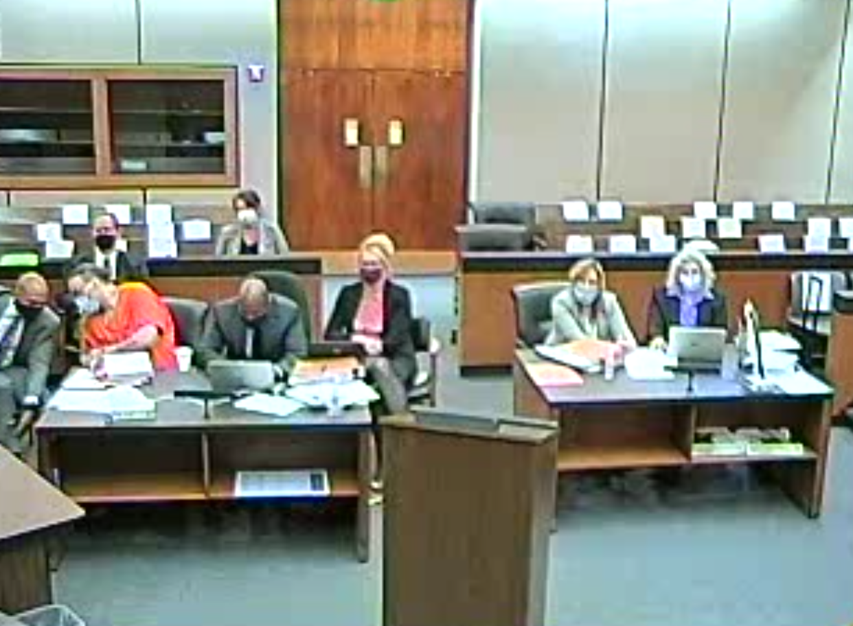 Donald Rourke (second from the left) speaks to his attorney at a November 17, 2020 hearing where his case was dimissed.