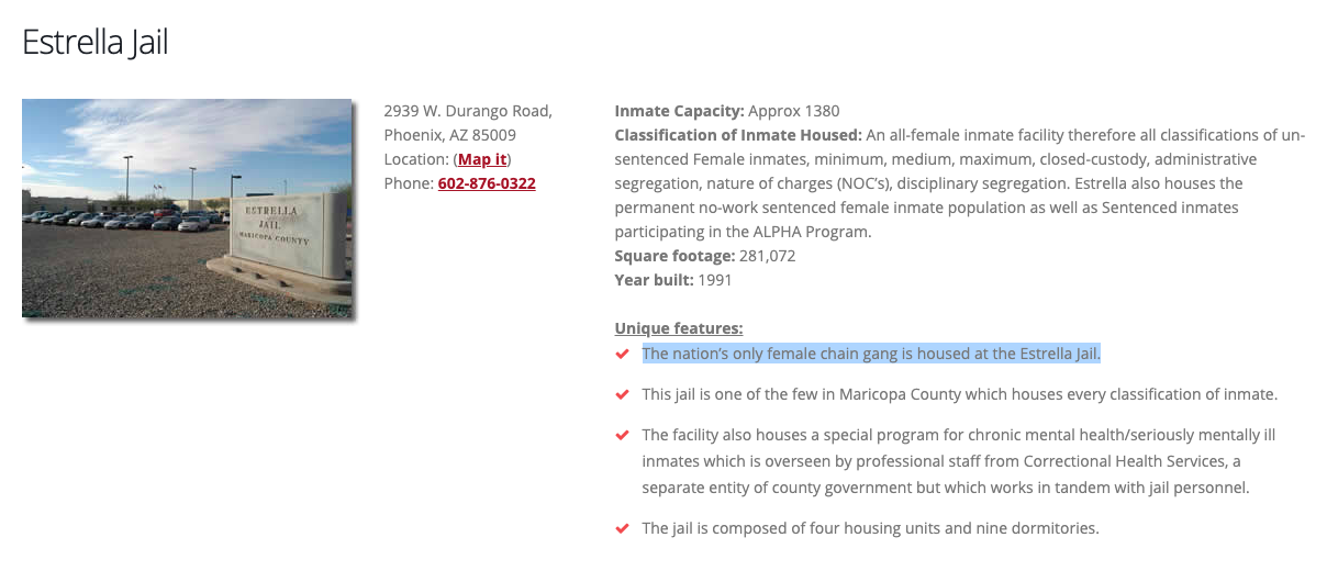 Today, the Maricopa County Sheriff’s Office website still boasts that a “unique feature” of the county’s Estrella Jail is that it is home to “the nation’s only female chain gang.”