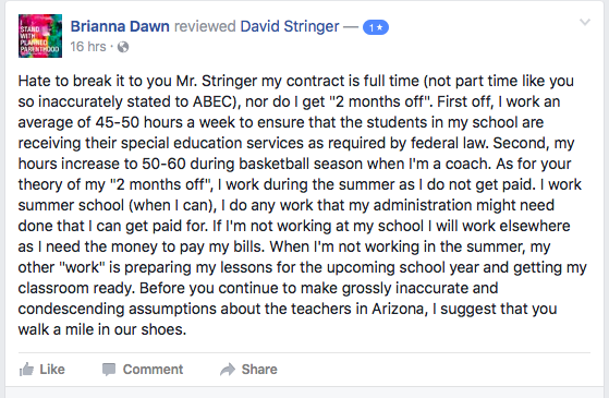 It’s understandable that it took so long for him to get back to us. It seems safe to say that Stringer was inundated with angry phone calls. Progress Now Arizona has asked teachers to call his office and “tell him your job isn’t easy or part time.”