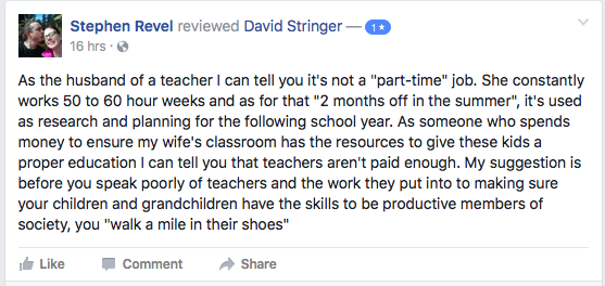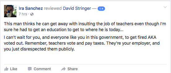 According to Representative Jesus Rubalcava, Stringer told the group that teaching doesn’t require a specific skill set. He then allegedly went on to say that teachers aren’t paid badly considering that they have easy part-time jobs with with two months off in the summer.