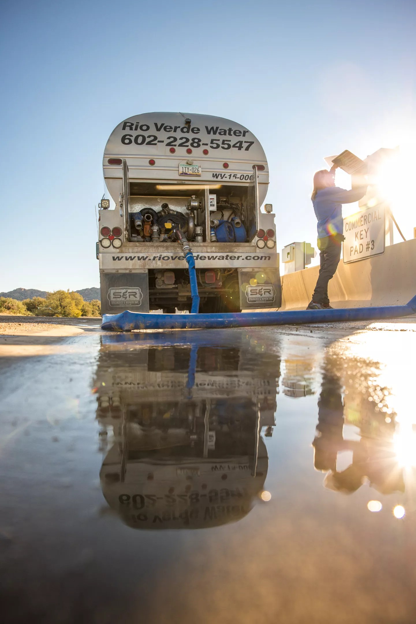 John Hornewer, co-founder of Rio Verde Water, connects his water hauling truck to the Scottsdale water station.