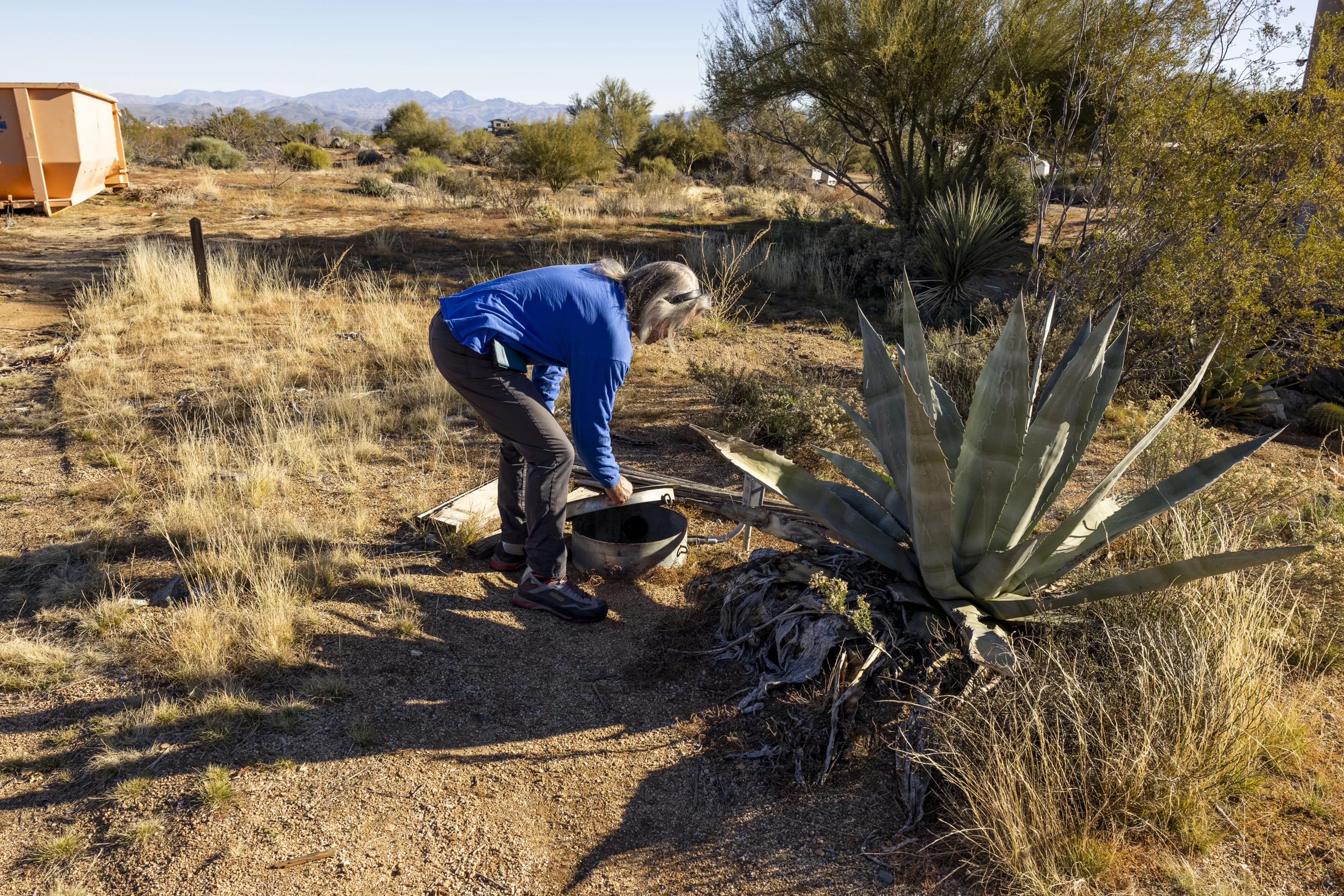 John Hornewer lifts the mouth of a cistern next to an agave plant in the Rio Verde Foothills.
