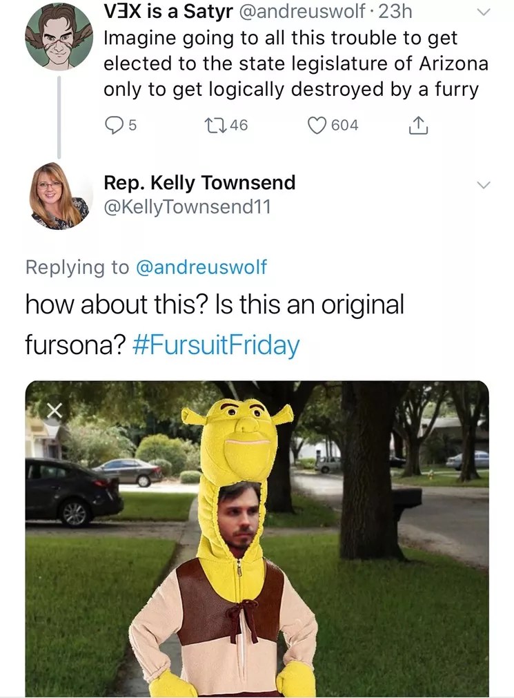 And don’t forget about when she benightedly jumped on the #FursuitFriday trend after stumbling across furry Twitter, which refers to people who enjoy having sex while donning animal costumes.