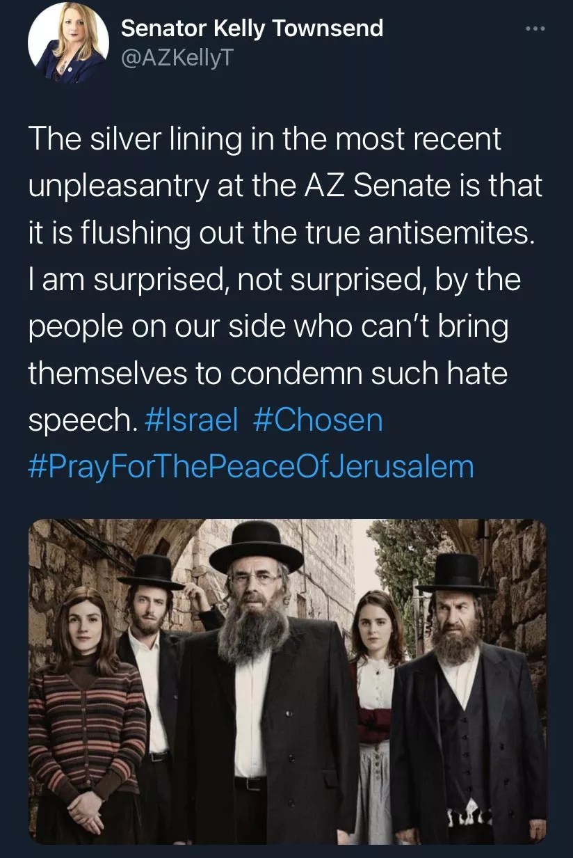 The silver lining in the most recent unpleasantry at the AZ Senate is that it is flushing out the true antisemites. I am surprised, not surprised, by the people on our side who can’t bring themselves to condemn such hate speech. #Israel #Chosen #PrayForThePeaceOfJerusalem pic.twitter.com/3XI8JXkcu7