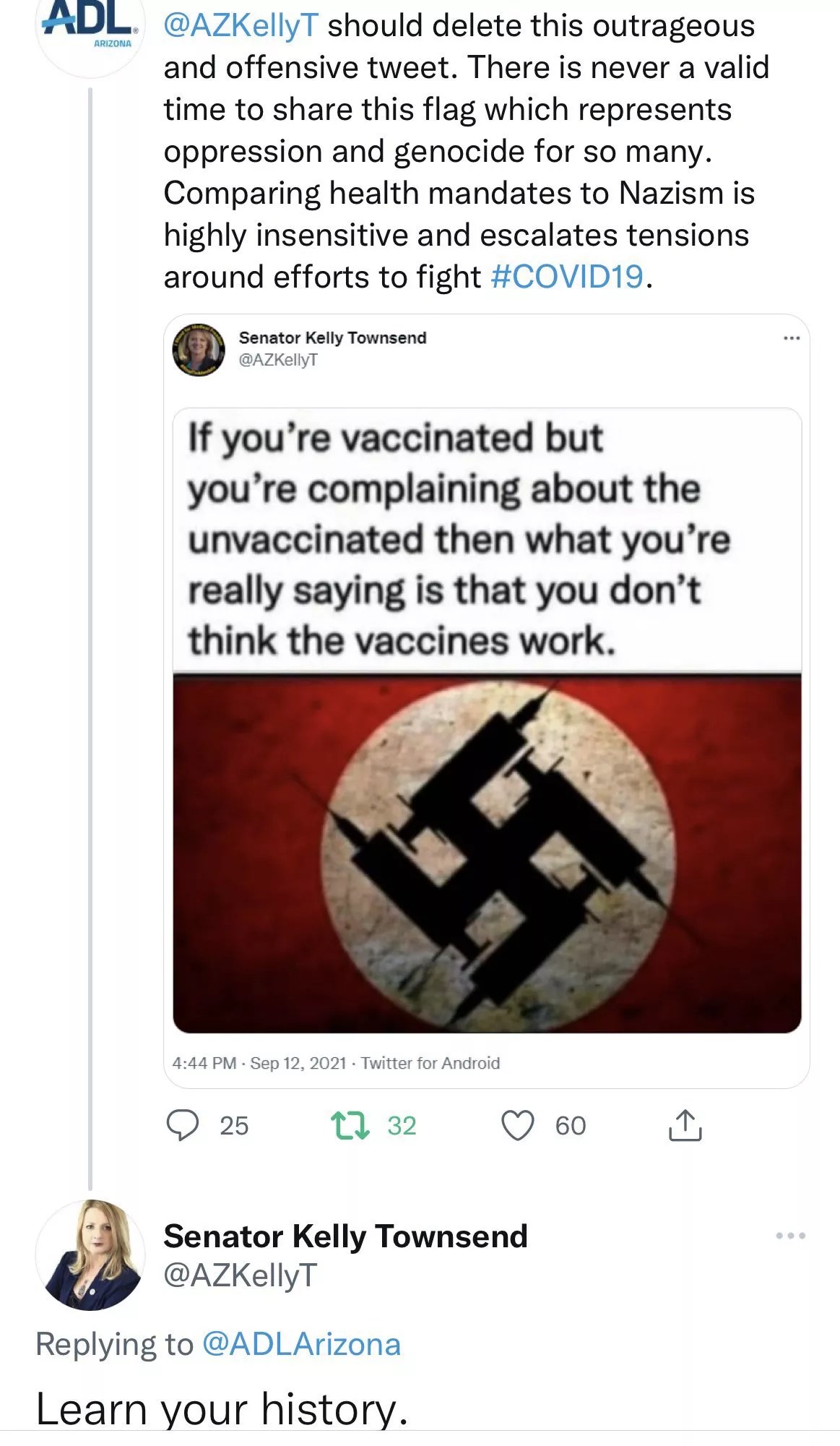 Townsend, a Republican representing East Mesa and Apache Junction, must not fancy herself among the “true anti-Semites,” despite tweeting an image of a Nazi flag in September 2021 when she obliquely compared coronavirus vaccine mandates to the slaughtering of 6 million Jewish people during World War II.