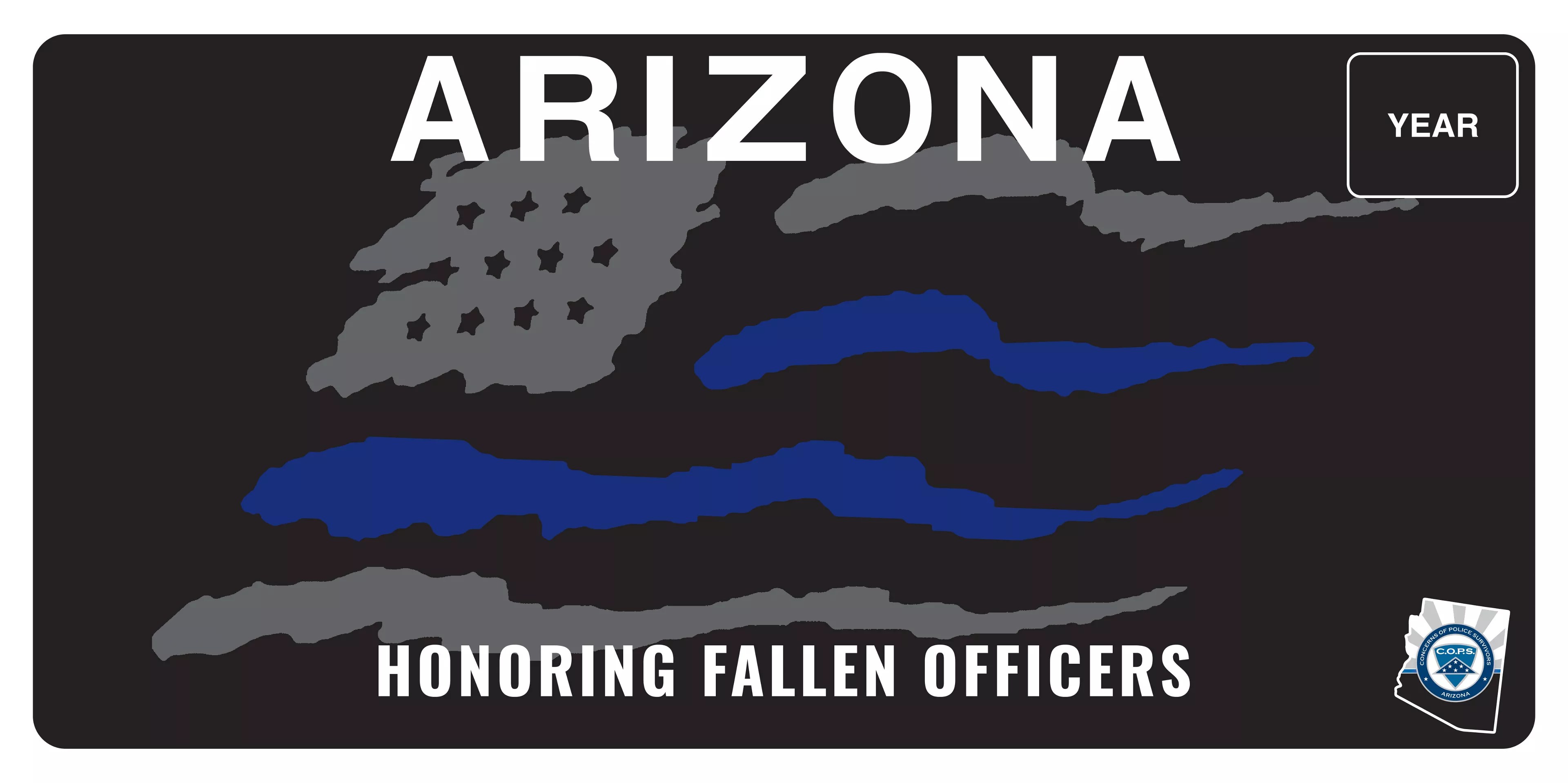 The black design for this plate is a relatively new one, replacing the original tan-and-blue motif. Proceeds from these plates go to C.O.P.S. Arizona – that stands for “Concerns of Police Survivors” – which offers support to families and coworkers of officers who die in the line of duty.