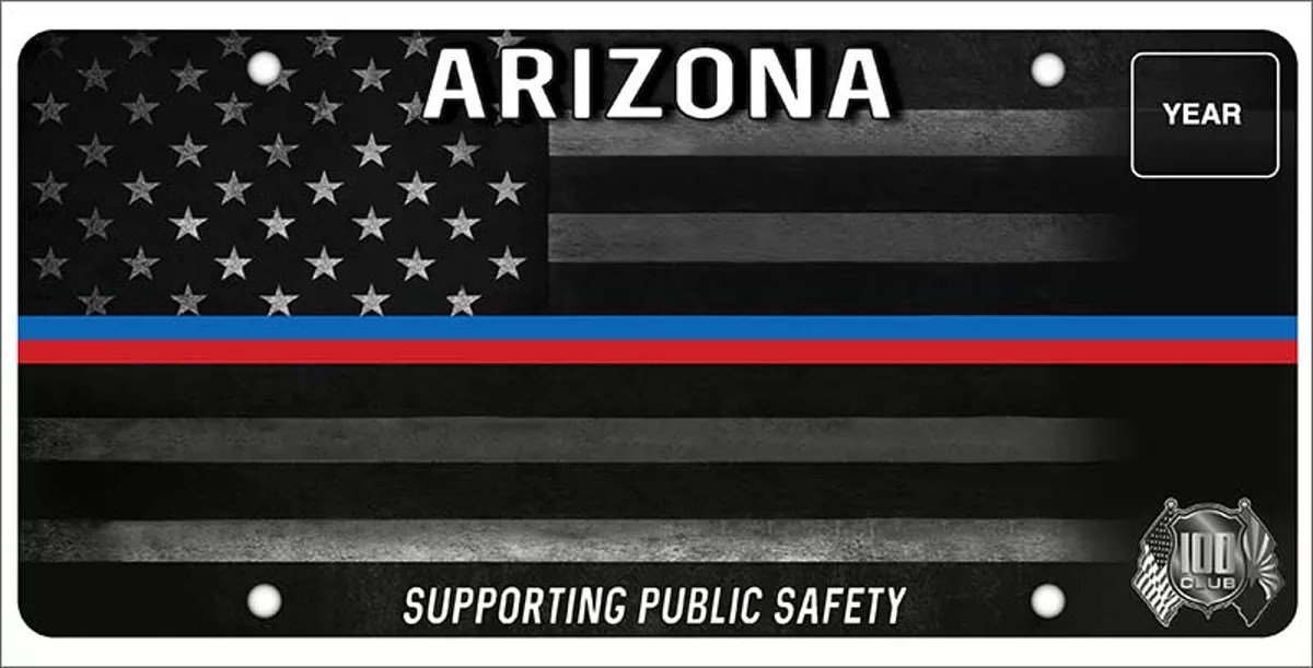 As the name suggests, this plate motif signals support for first responders, though it incorporates the design of the controversial and divisive Thin Blue Line flag. Proceeds from sales of this plate benefit the 100 Club of Arizona, which provides “assistance, including immediate financial aid, educations (sic), and ongoing support for all public safety members and their families.”