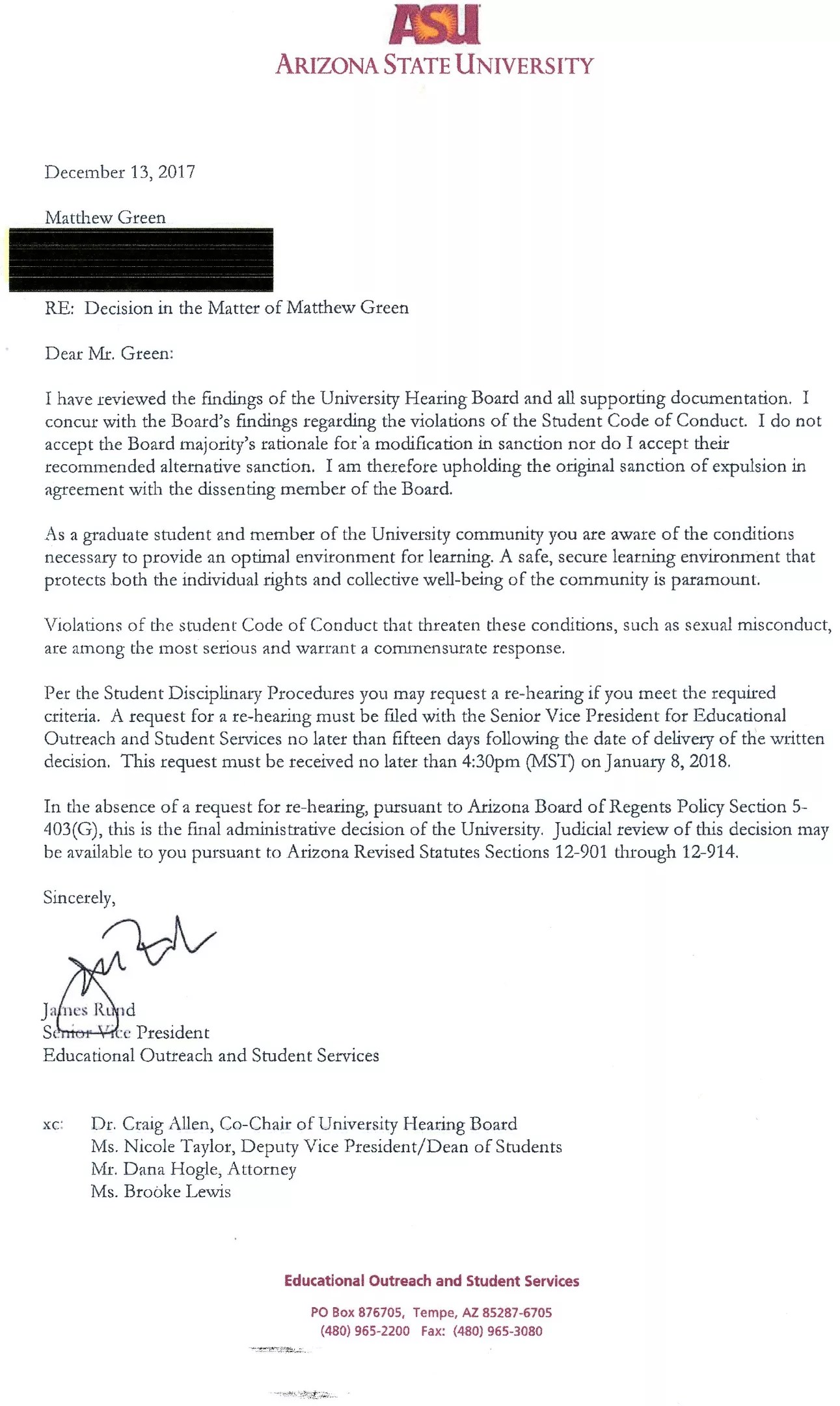 Green appealed the decision immediately, leading to a hearing on November 17 overseen by the three-member University Hearing Board. The board consisted of chair Craig Allen, the associate dean of Barrett Honors College, Melissa Samuelson, a clinical assistant professor at the W. P. Carey School of Accountancy, and student representative Jose Rodriguez. Several other ASU officials attended the hearing, as well.