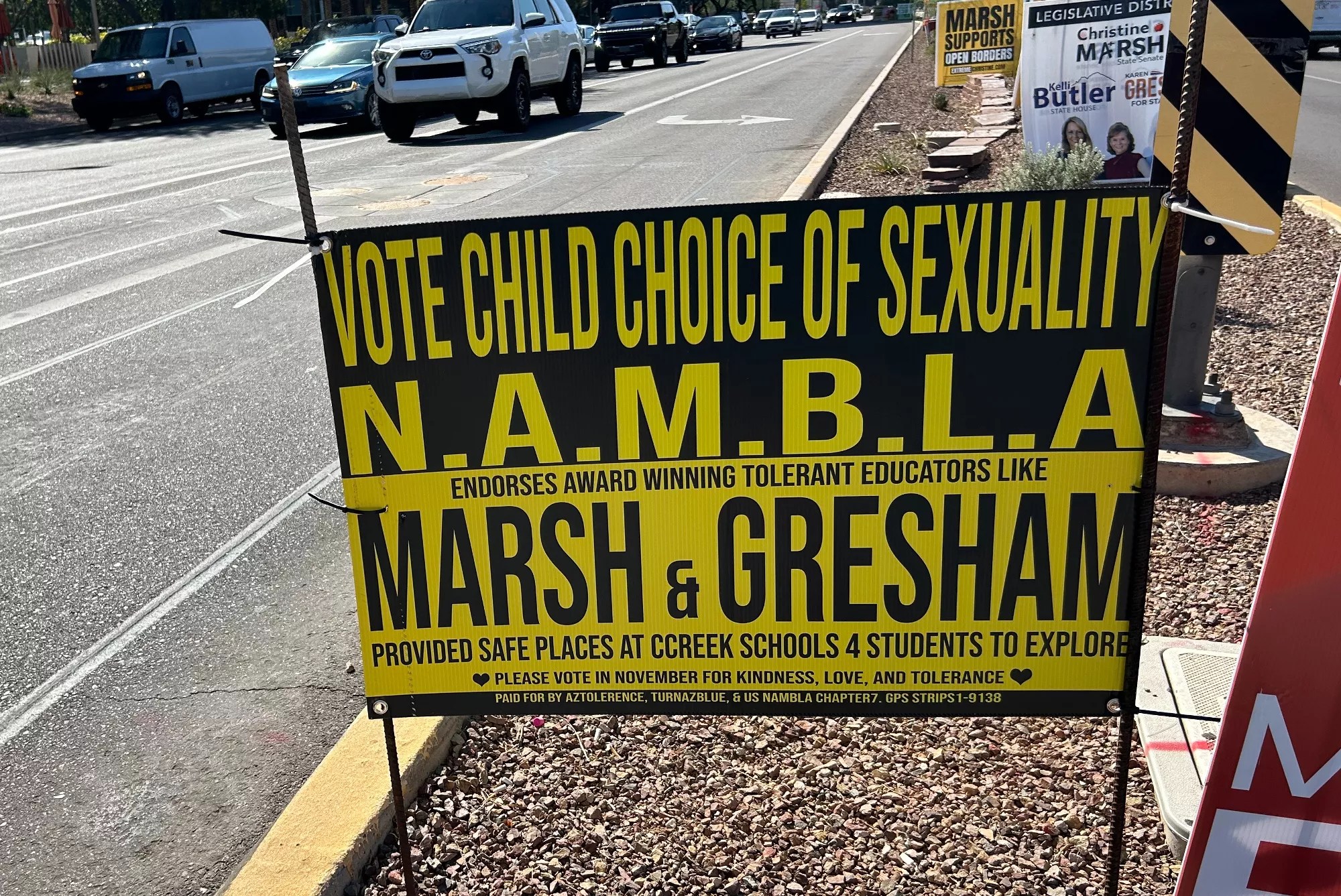 Marsh also noted that the sign is “not sponsored by a legal PAC, giving them free rein to lie without any legal repercussions because there’s no way to track down the culprits.” Taracena added that “making uncorroborated, harmful claims is what we’ve come to expect from the Arizona Republican Party,” although no evidence has surfaced that anyone associated with the GOP is behind the NAMBLA sign.