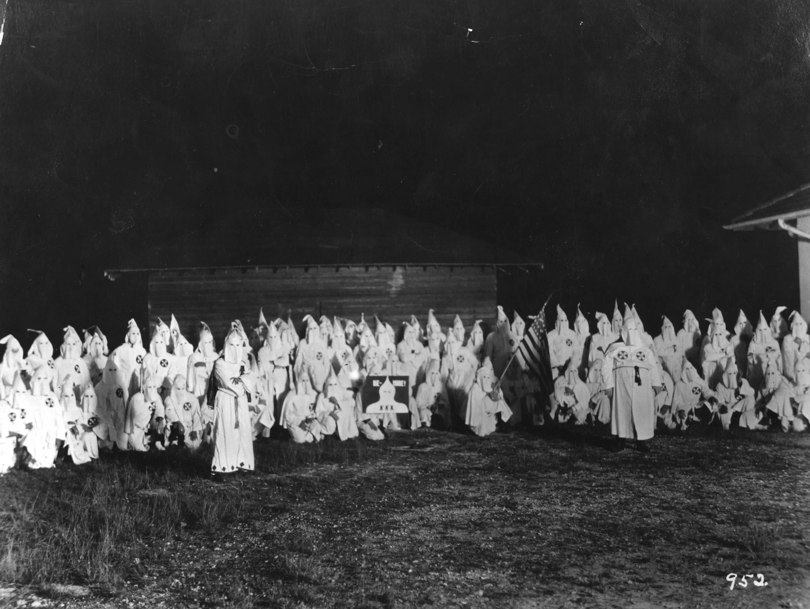 A meeting of the hooded members of the American white supremacist movement, the Ku Klux Klan, circa 1920.