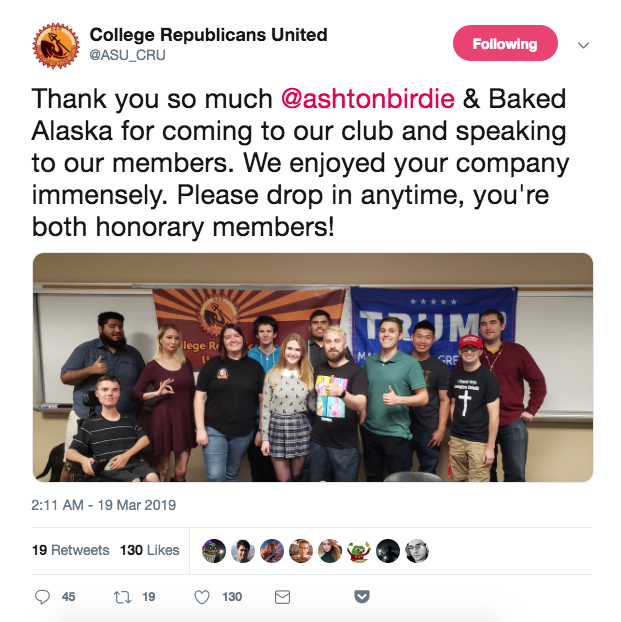 Gionet recently stopped by Arizona State University for an event with College Republicans United (CRU), a far-right offshoot of the school’s College Republicans. The group, which remains eligible to receive school funds, on Tuesday tweeted a photo of Gionet posing with a small gathering of students. (Gionet is standing in the front row, wearing a black shirt and giving a thumbs up.)