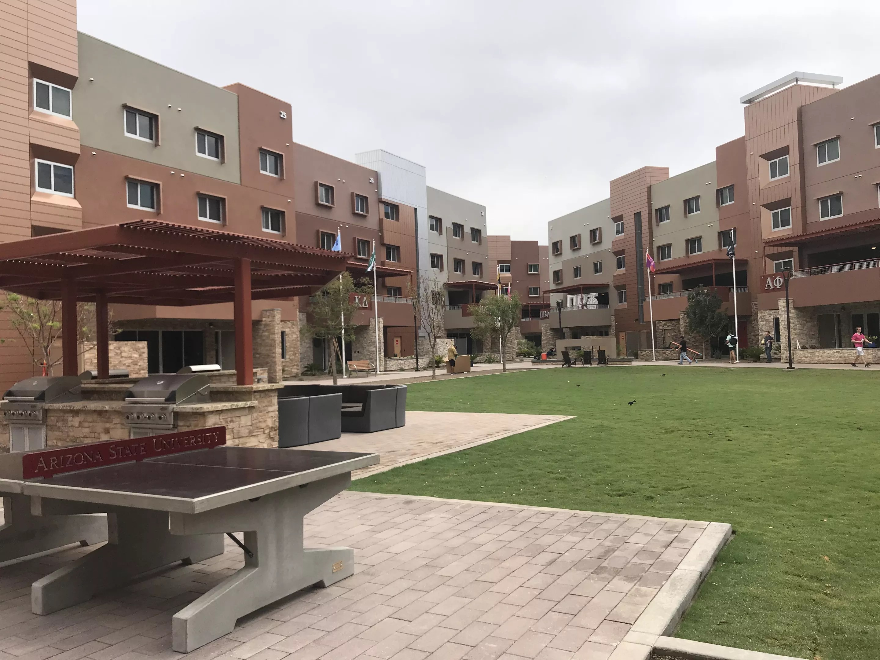 The gated complex comes equipped with several outdoor barbecues, concrete ping-pong tables donning nets with ASU insignia, benches, and a triangular grass quad. When New Times visited in mid-August, yard crews were still placing sod into grassy areas and planting shrubbery along walking paths.