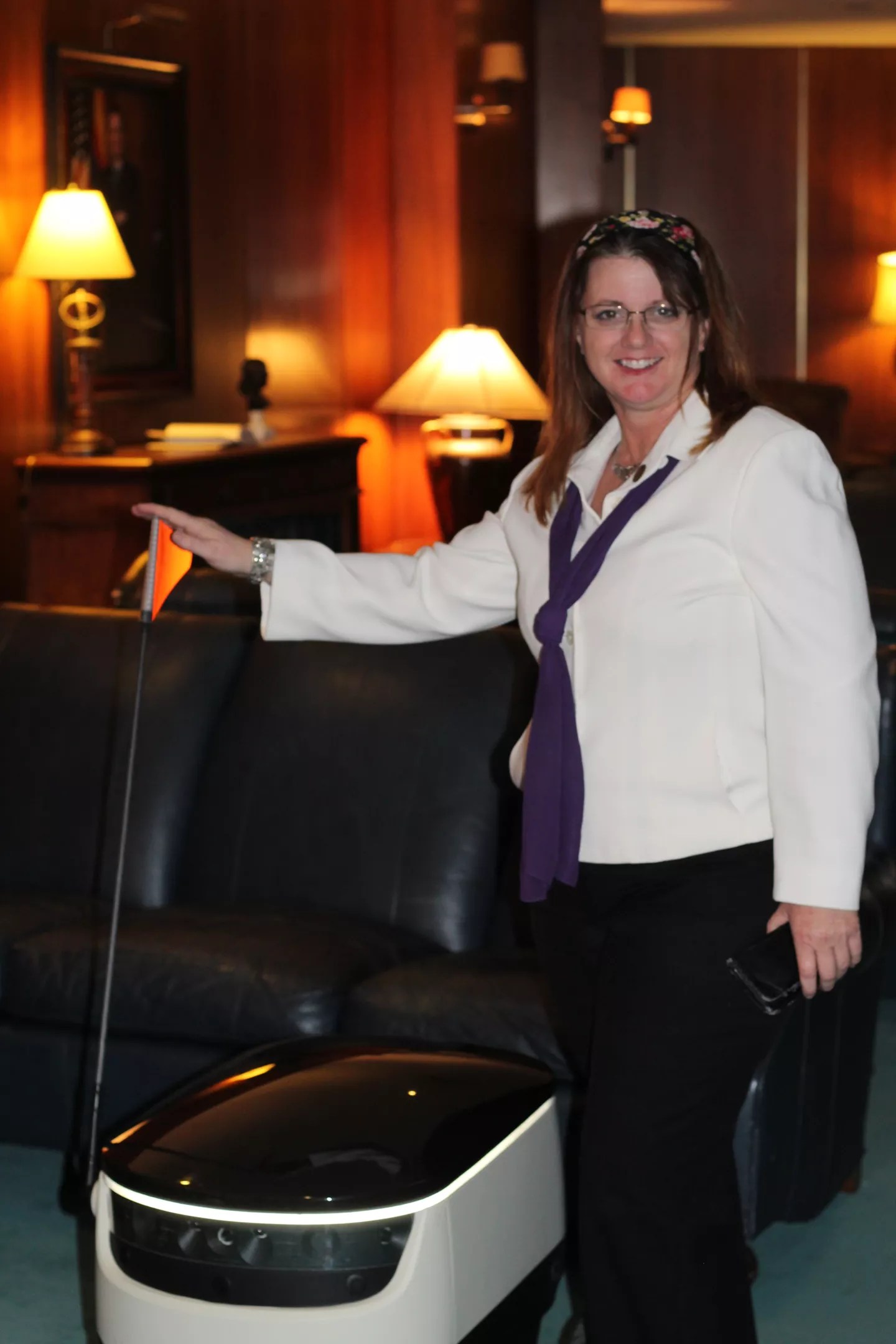 After the brief show on the Capitol grounds, Pineda and Starship spokesman David Catania took Seven into the House of Representatives building. A security officer opened its top and checked the cargo compartment before waving it through. The trio of two humans and one robot from Starship hung out in the House lounge for a little while, waiting for a hearing before the House Transportation and Infrastructure Committee.