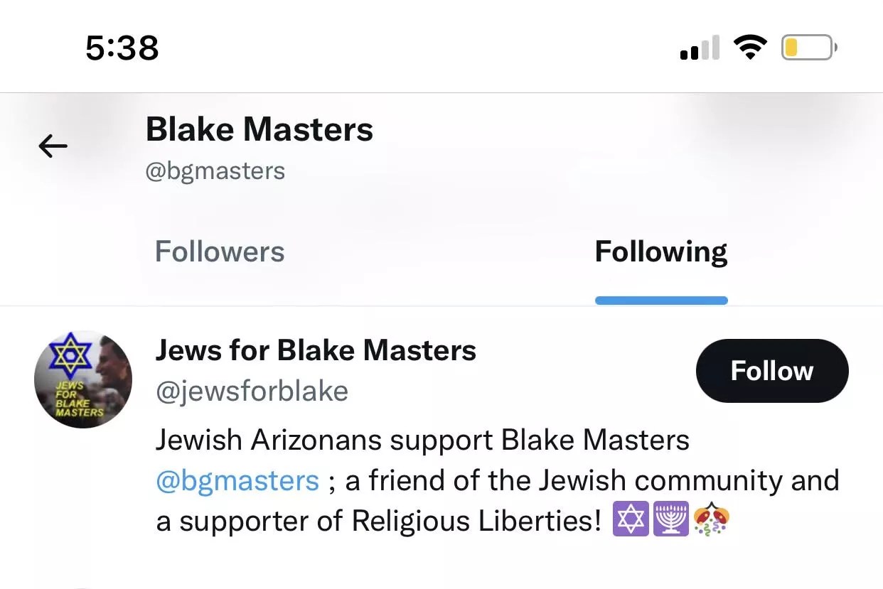 Jews for Blake is not associated with the Masters campaign, but Masters is one of its 145 followers on Twitter.