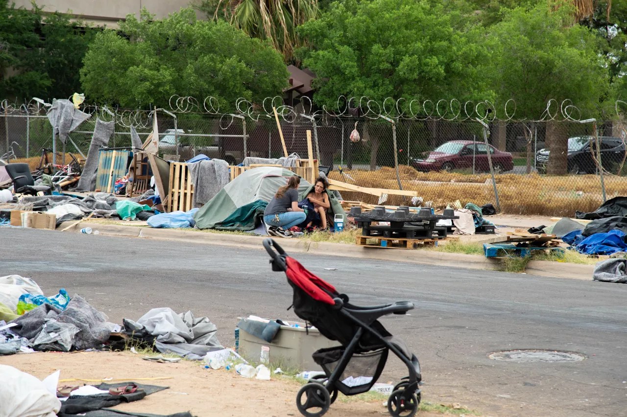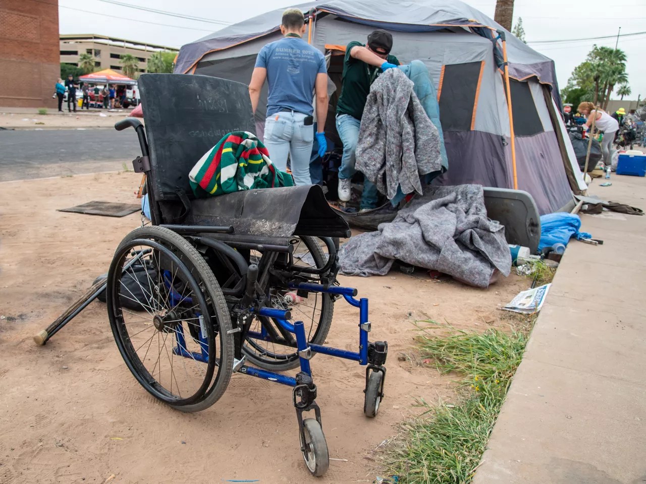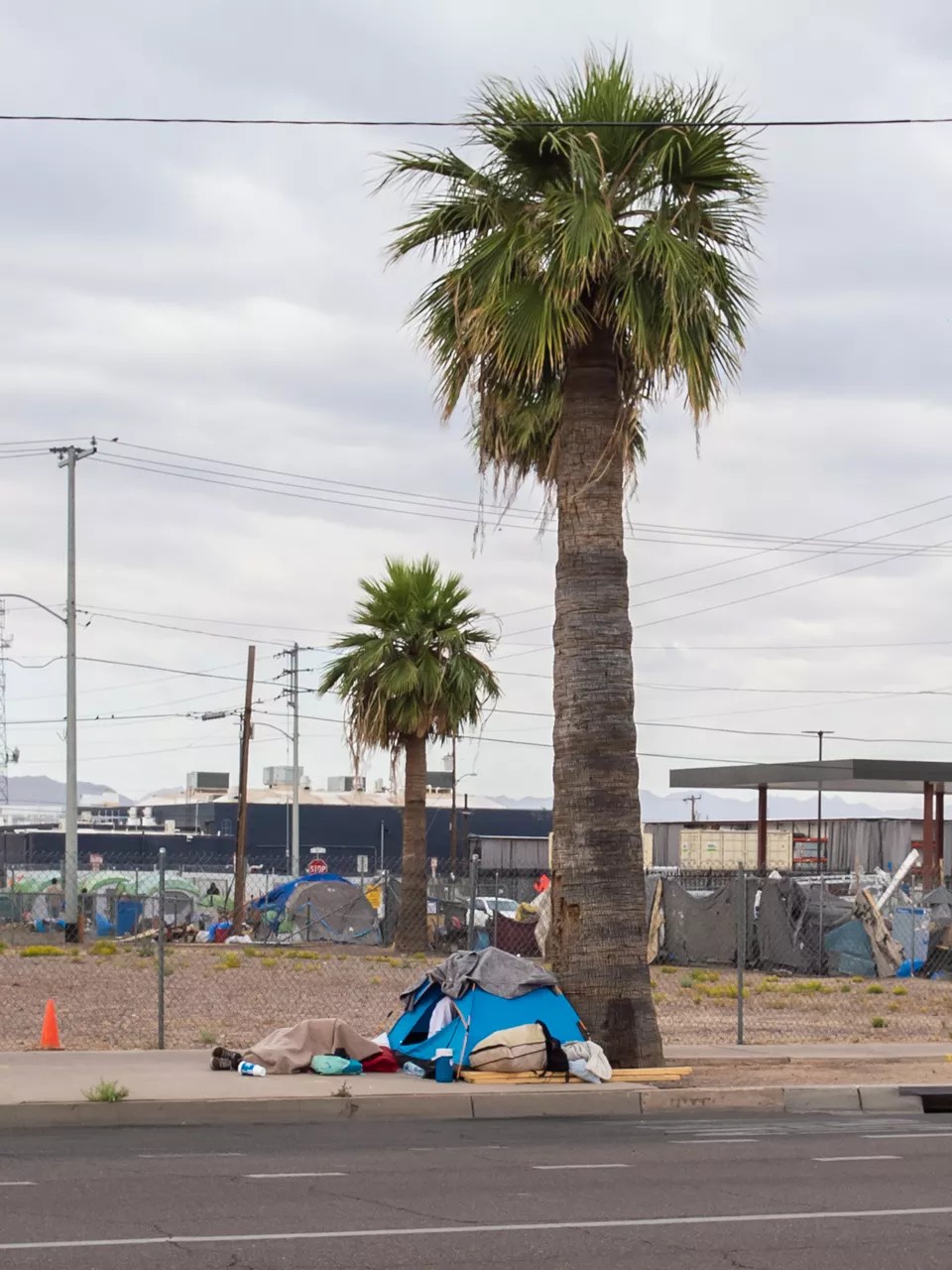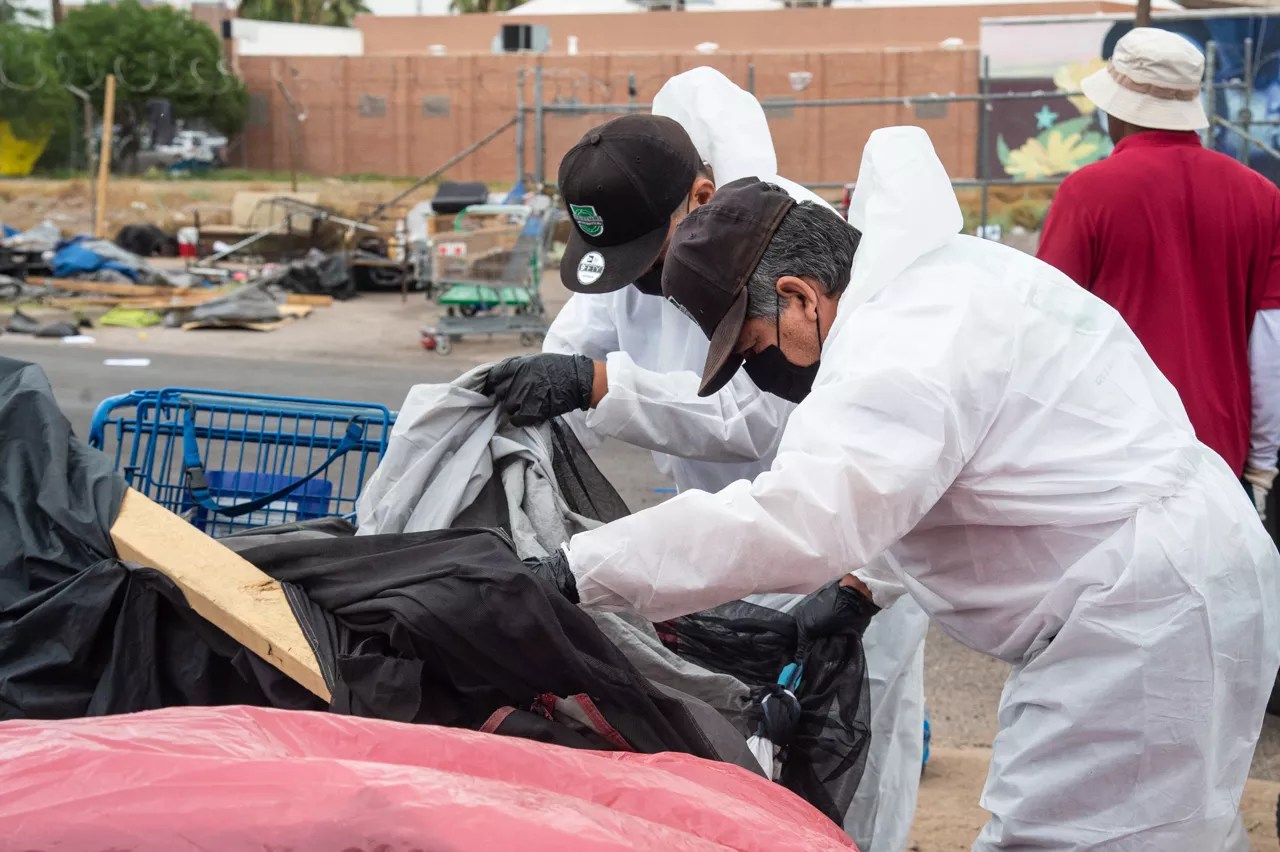 A copy of a recent Arizona Republic sits on a pile of trash while hazmat-clad city officials remove a Zone structure. The newspaper was open to an article titled “Here are the Best Summer Staycation Deals in the Valley.” It is a haunting juxtaposition between the city’s haves and have-nots.