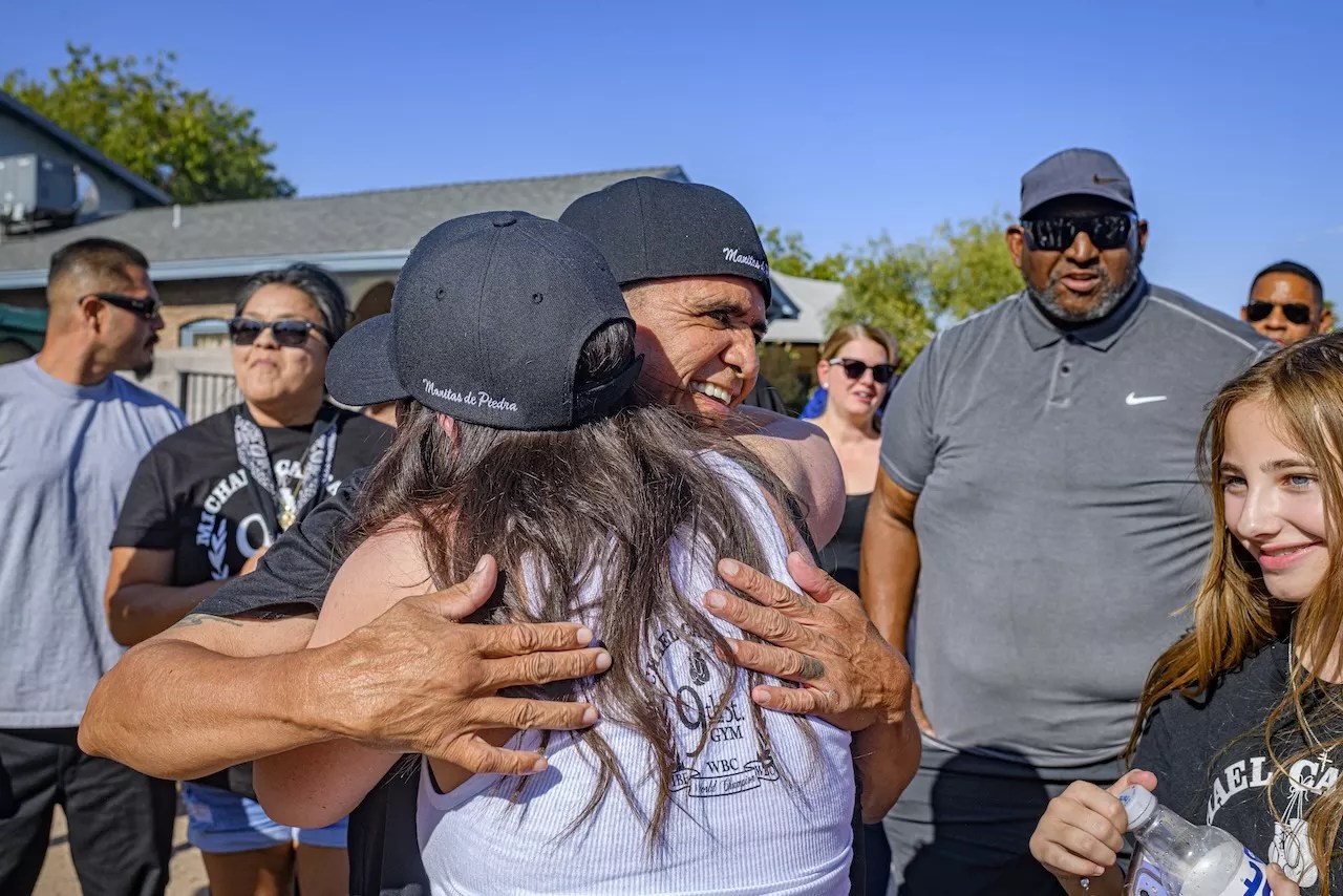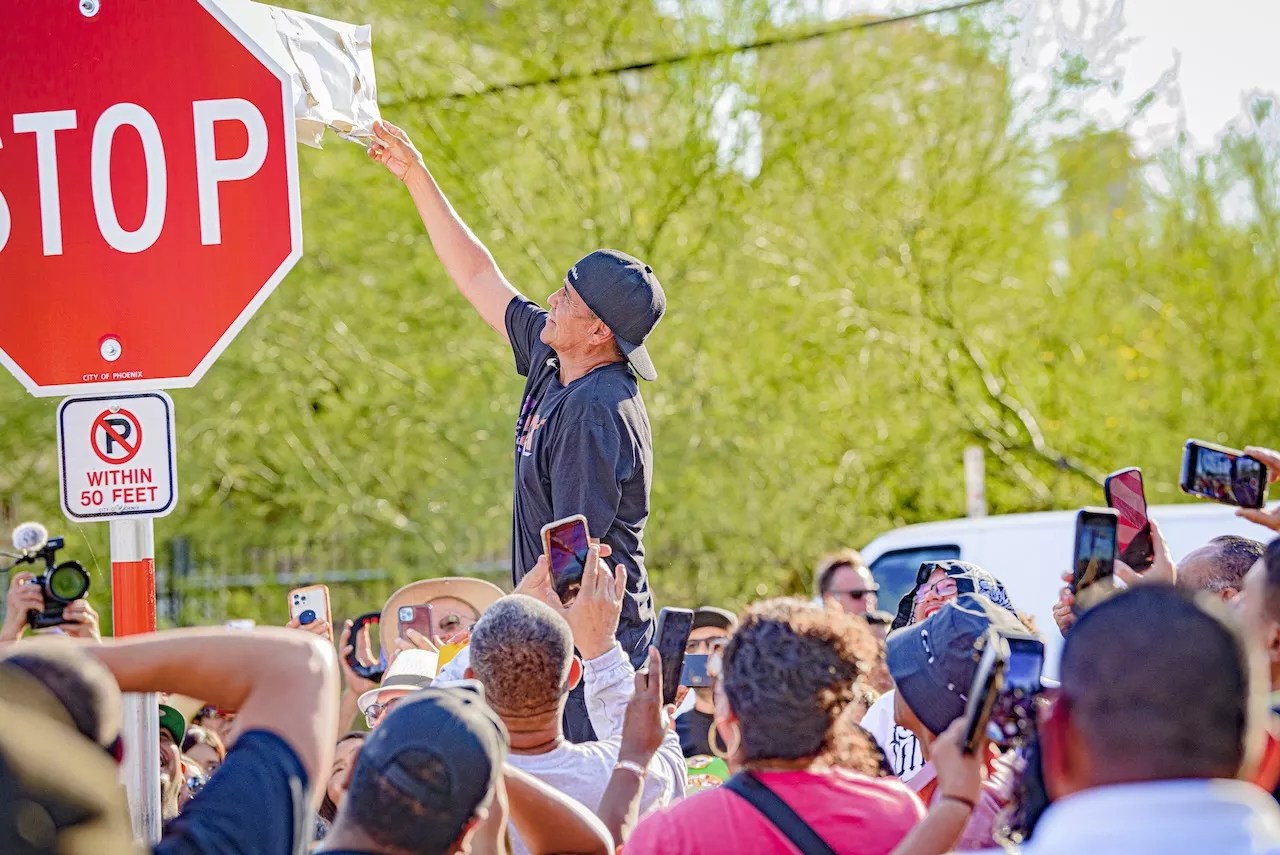 Fans and loved ones cheer on Phoenix boxing great Michael Carbajal as he unveils a sign for Michael Carbajal Way on Monday.