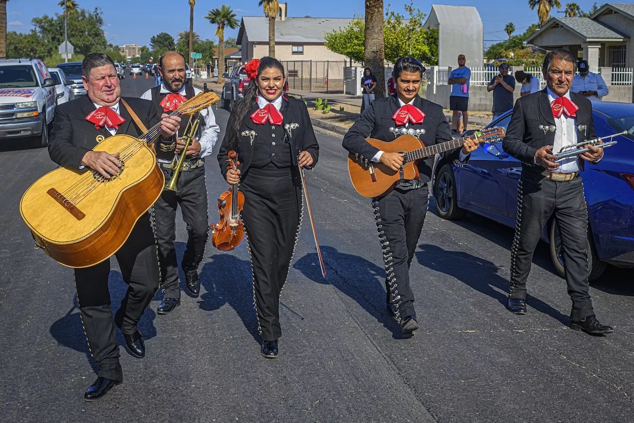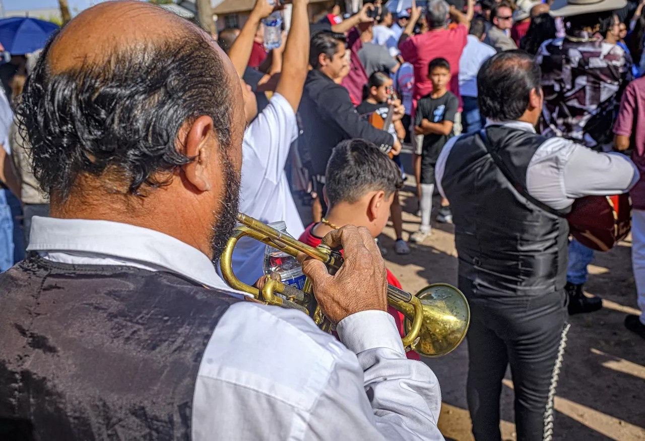 A mariachi trumpeter performs before the unveiling of Michael Carbajal Way in Phoenix.