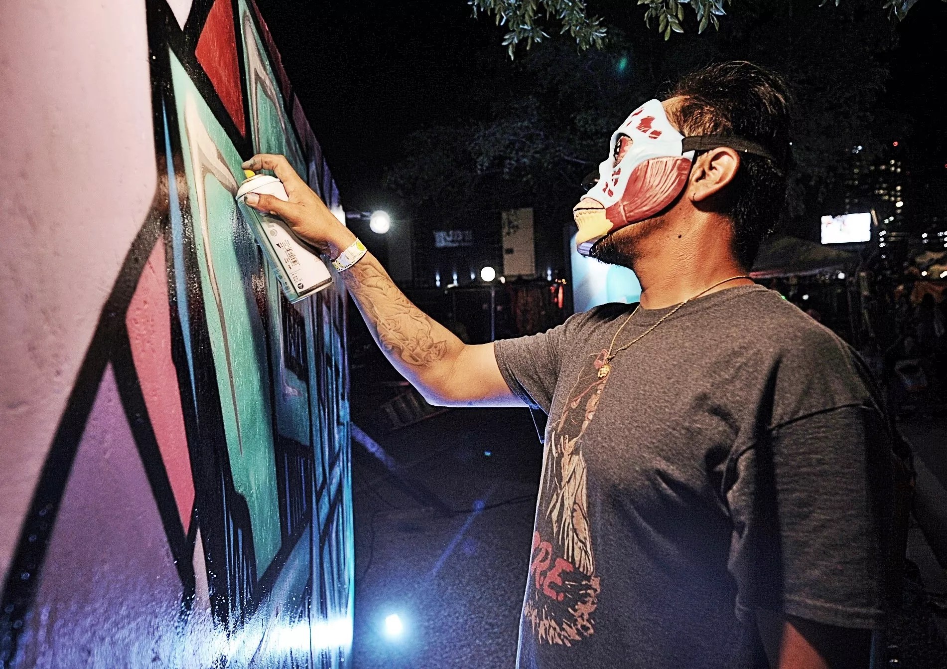 One of the more dynamic murals seen at Buds-A-Palooza was the graf art creation painted by Phoenix street artist Daer, who used cans of brightly colored spray paint to add swooping oversized letters to a giant plywood canvas. He also did it while wearing a mask resembling one of the insidious aliens from the 1988 cult film They Live.