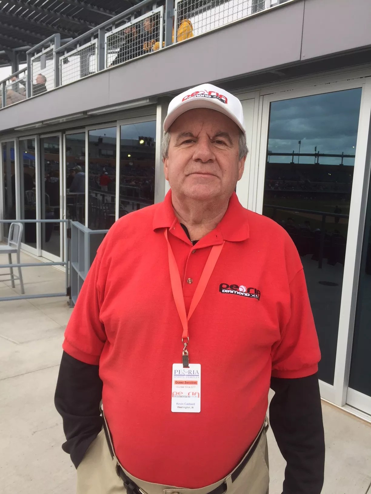 Yet outside, Kevin Caldwell is cheerfully helping anyone who needs it. He’s one of 554 volunteers with the Peoria Diamond Club who usher, take tickets, sell 50-50 raffle chances, etc., at the Cactus League games.